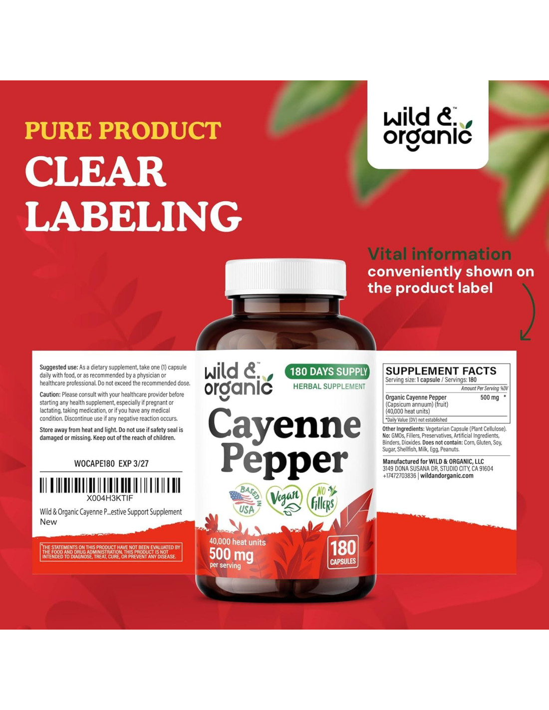 - Suministro de 180 Días: Cada botella del suplemento de extracto de cayena Silvestre y Orgánica contiene 180 cápsulas de polvo de cayena, proporcionando un suministro de 180 días al tomar una cápsula por día.