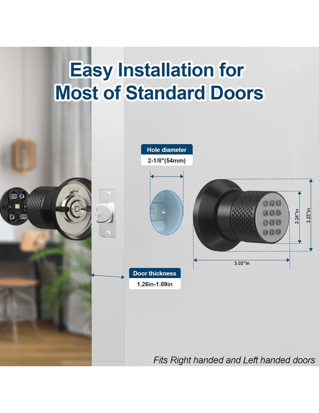 - [AMPLIA APLICABILIDAD] : Hay una amplia gama de aplicaciones de esta cerradura inteligente y se puede usar ampliamente en todo tipo de puertas de diferentes materiales. Por ejemplo, puerta de madera, puerta de metal, puerta de vidrio y puerta de acero inoxidable, entre otras. Se adapta a un grosor de puerta entre 3.2cm~4.8cm/1.26pulgadas~1.89pulgadas