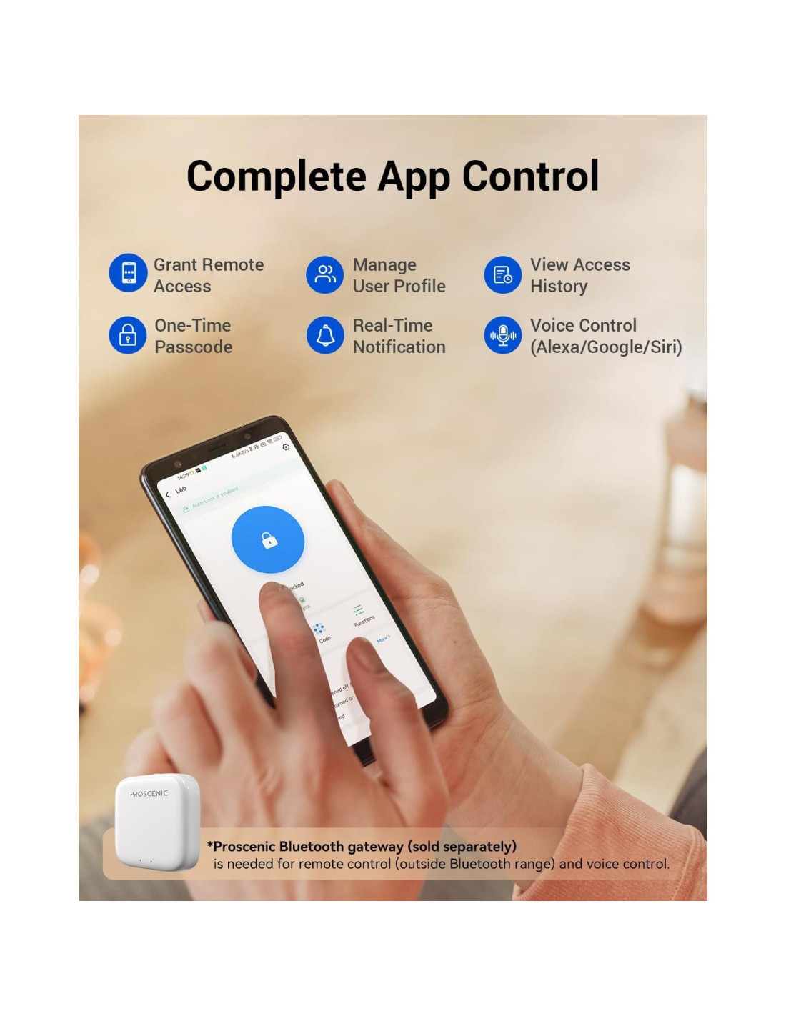 - Usa la App Proscenic para bloquear/desbloquear, otorgar acceso remoto, gestionar perfiles de usuario, ver historial de acceso, recibir notificaciones en tiempo real y emitir códigos de un solo uso o recurrentes a familiares, invitados o proveedores de servicios