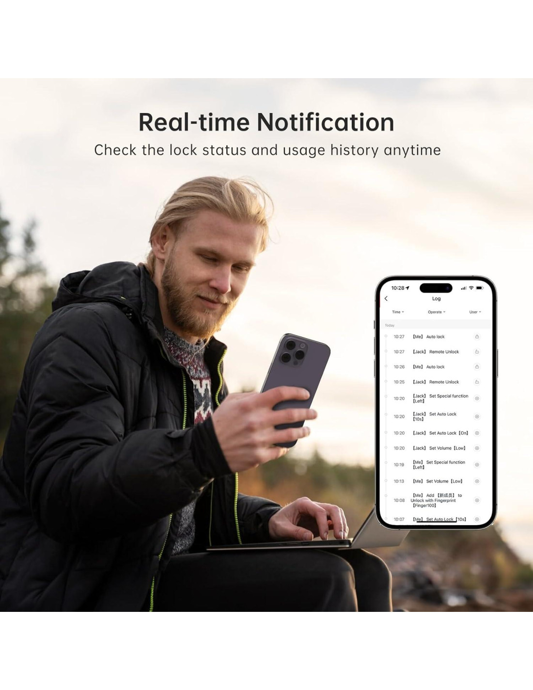 - Control remoto fácil: Simplemente añade la puerta de enlace incluida para controlar tu cerradura a través de la APP. Puedes bloquear y desbloquear, compartir acceso para invitados, ver registros de acceso en vivo y recibir notificaciones instantáneas de cualquier cambio en el estado de la puerta en cualquier momento.