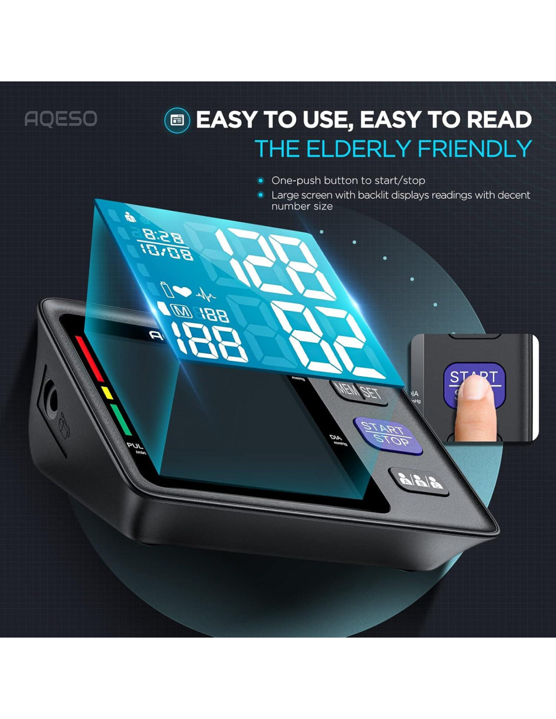 - Lectura Precisa y Rápida - La manga de presión arterial automática AQESO cuenta con tecnología ASP (Procesamiento de Señal Precisa) mejorada. Más precisa y rápida para obtener lecturas en 30s. Más de 100,000 datos han sido probados por su fiabilidad y calibrados para el mejor rendimiento. Puede estar seguro de detectar problemas de hipertensión mediante la barra de clasificación colorida de la OMS.