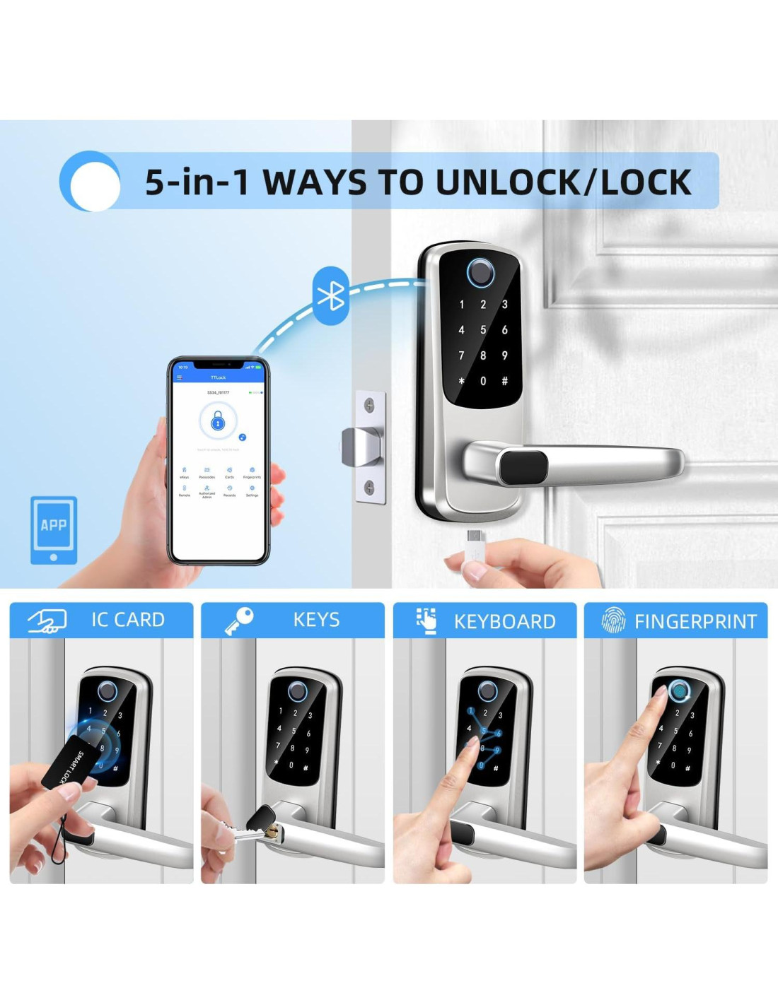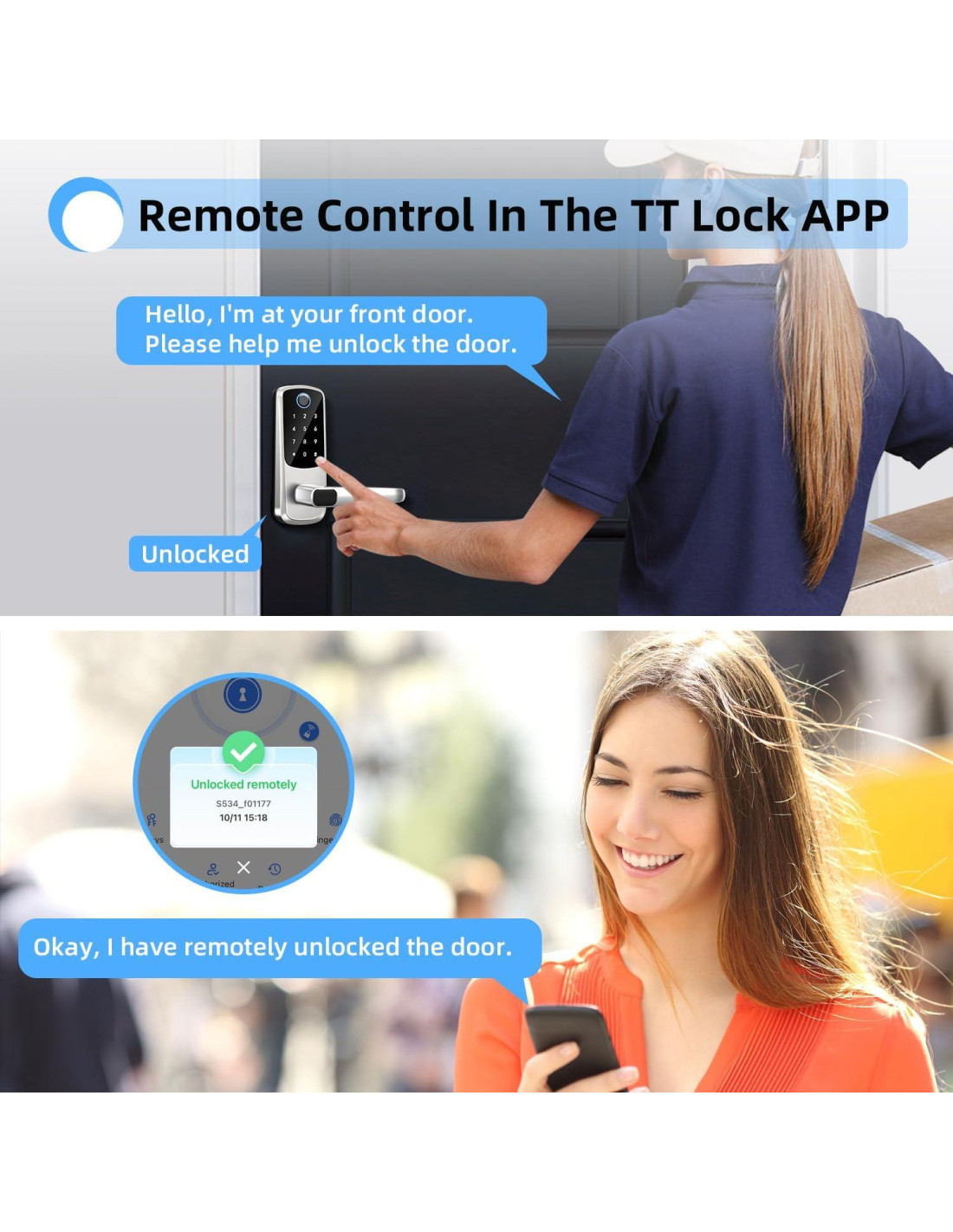 - Cerradura de Entrada Sin Llave 8-en-1: Cerradura inteligente avanzada 8-en-1 con manija: Huellas dactilares + Código de Teclado Táctil + Tarjeta IC + Compartición de Ekey + Desbloqueo Automático + Llaves Mecánicas + Control de APP TT Lock + Control por Voz Alexa (Desbloqueo remoto requiere gateway por separado) Experimenta la conveniencia de múltiples métodos de desbloqueo, proporciona opciones de acceso amigables para niños y ancianos, nunca te preocupes por quedarte fuera de nuevo.
