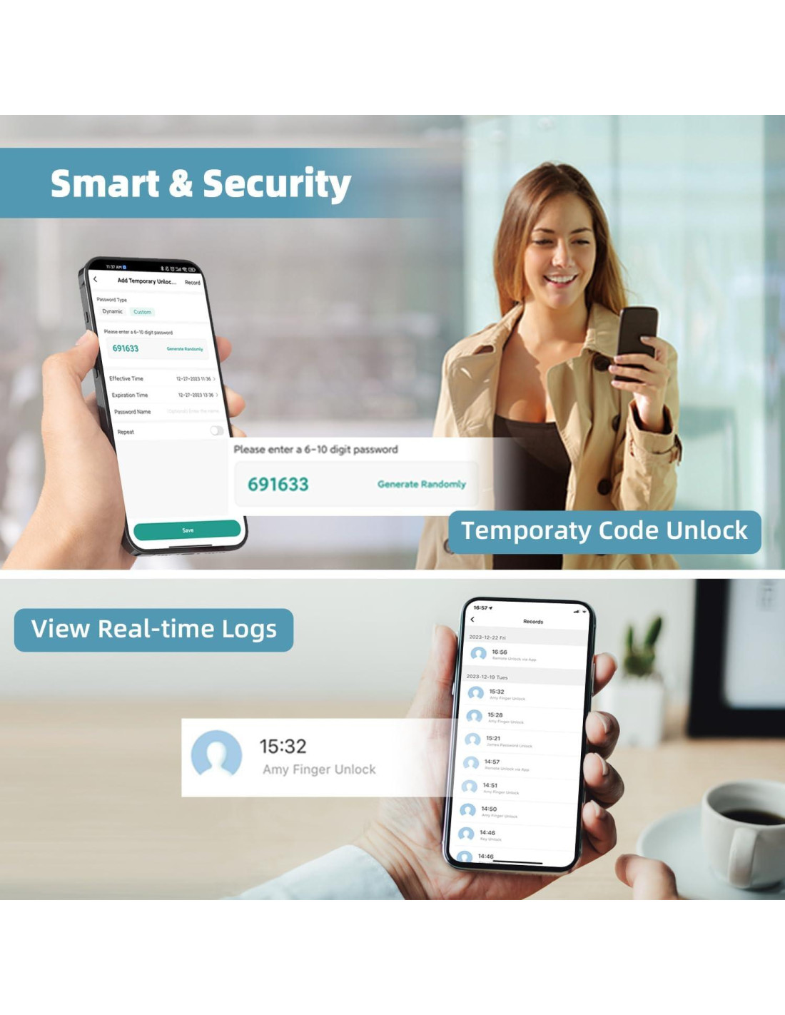 - Características especiales: Huellas Dactilares, Contraseña Antispy, Cerradura de Un Toque, Auto-Cerradura