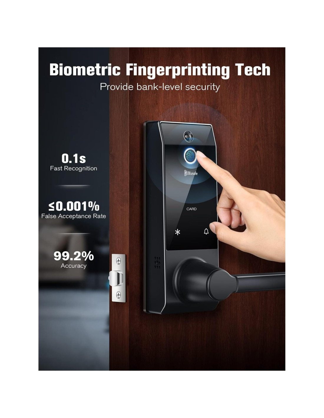 - [SEGURIDAD DE GRADO BANCARIO CON SENSOR BIOMÉTRICO DE HUELLAS DACTILARES] Las cerraduras de huellas dactilares Blusafe utilizan un avanzado sensor biométrico de huellas dactilares 3D para proporcionar seguridad de grado bancario para su hogar. A diferencia de las huellas ópticas, la cerradura de huella dactilar reconoce con precisión su huella en 0.5 segundos con una resolución de hasta 508 dpi, evitando que desbloquee la puerta copiando su huella. Con una capacidad de huellas de hasta 100, puede compartirla fácilmente con familiares, amigos, paseadores de perros, amas de llaves y más.