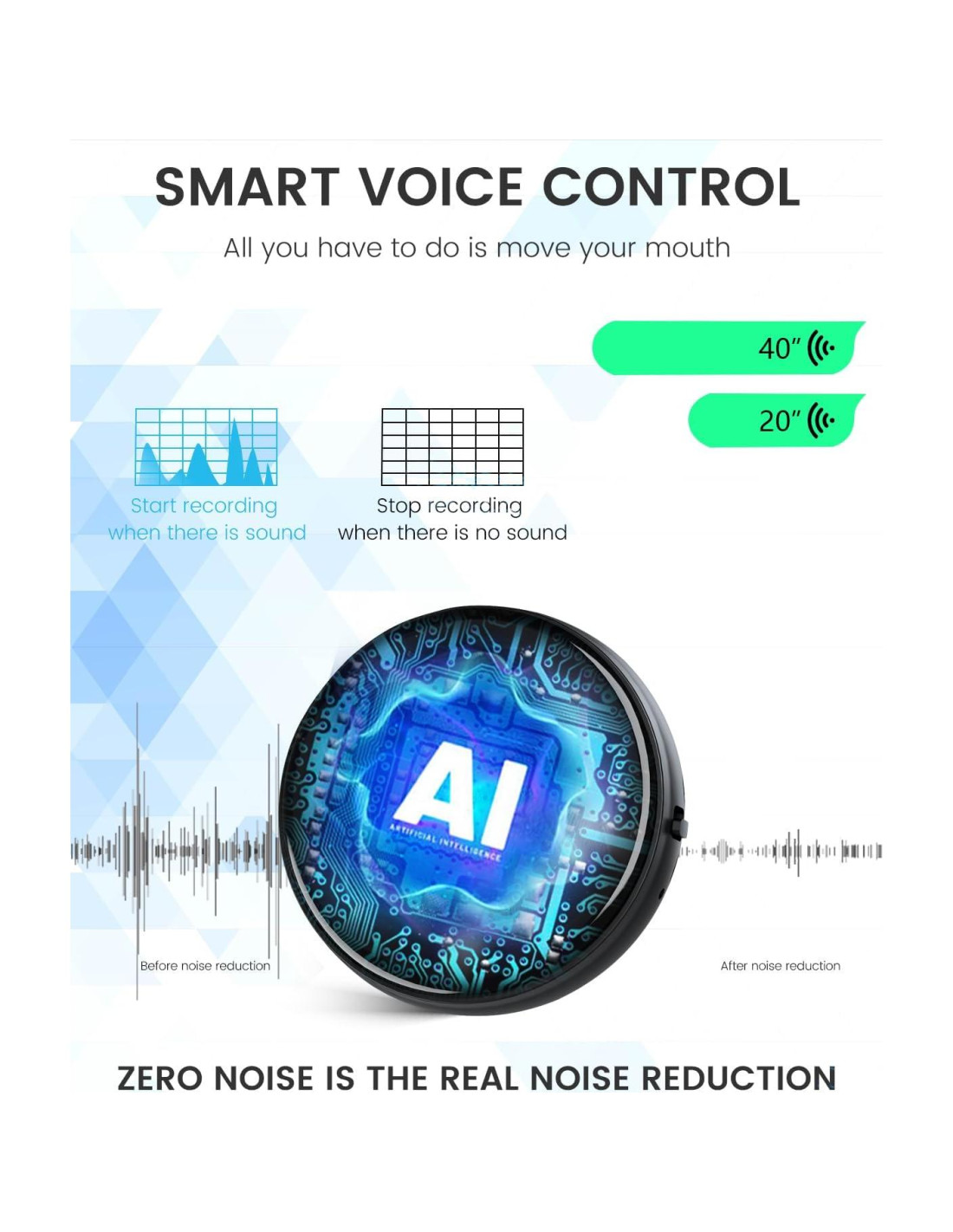 - [Activación de Voz Inteligente] Esta grabadora activada por voz inteligente inicia automáticamente la grabación al detectar sonidos >45dB, lo que la hace ideal para grabadoras de reuniones, dispositivos de grabación encubiertos y herramientas de captura de conferencias. La función de pausa inteligente ahorra espacio de almacenamiento mientras mantiene la continuidad del audio.