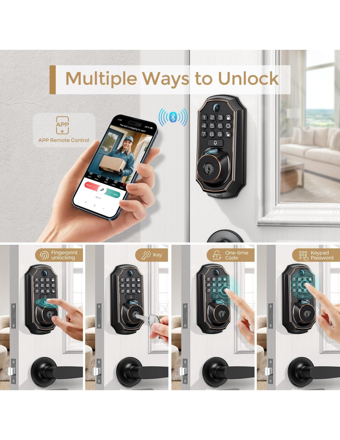 - Cerradura Inteligente WiFi Multifuncional: La Cerradura de Puerta WiFi con Cámara combina entrada sin llave, reconocimiento de huellas dactilares, control por APP y acceso con llave tradicional para una comodidad definitiva. Esta cerradura inteligente 5 en 1 integra una cámara, timbre y función de bloqueo automático, lo que la convierte en la actualización perfecta para la seguridad del hogar moderno.