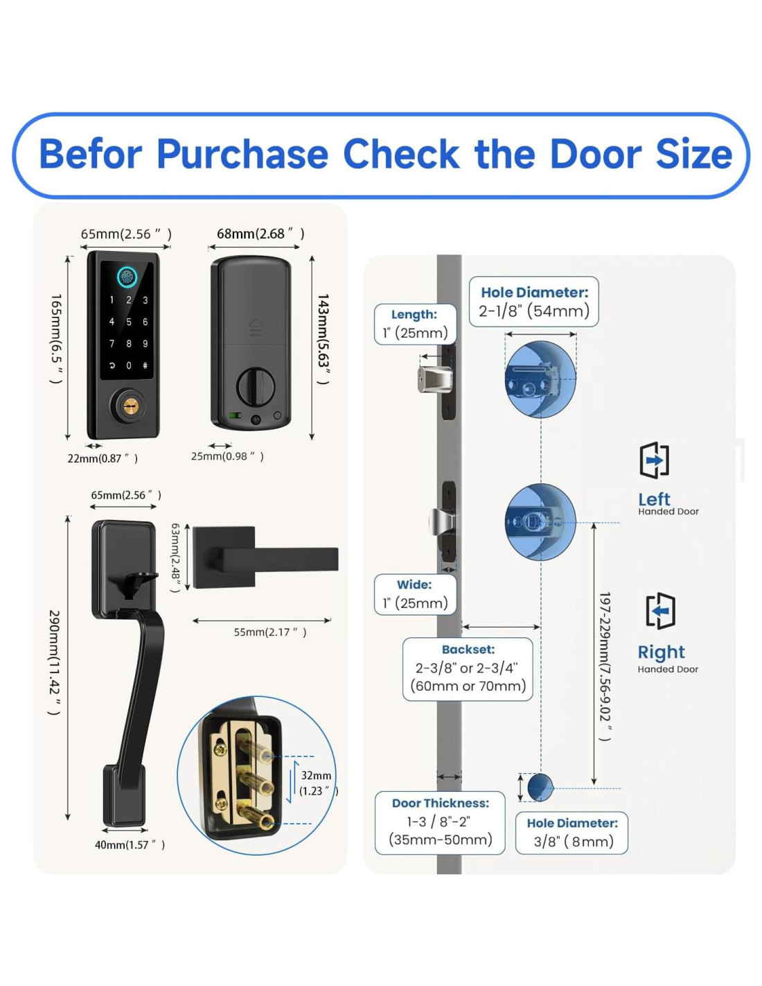 - Verificación de Tamaño: La cerradura sin llave es adecuada para puertas de mano izquierda y mano derecha. Asegurando compatibilidad con puertas estándar de EE. UU. con un grosor de 35-50mm (1.38-1.97). Es fácil de instalar con solo un destornillador, mediante un manual detallado y un video de instalación.