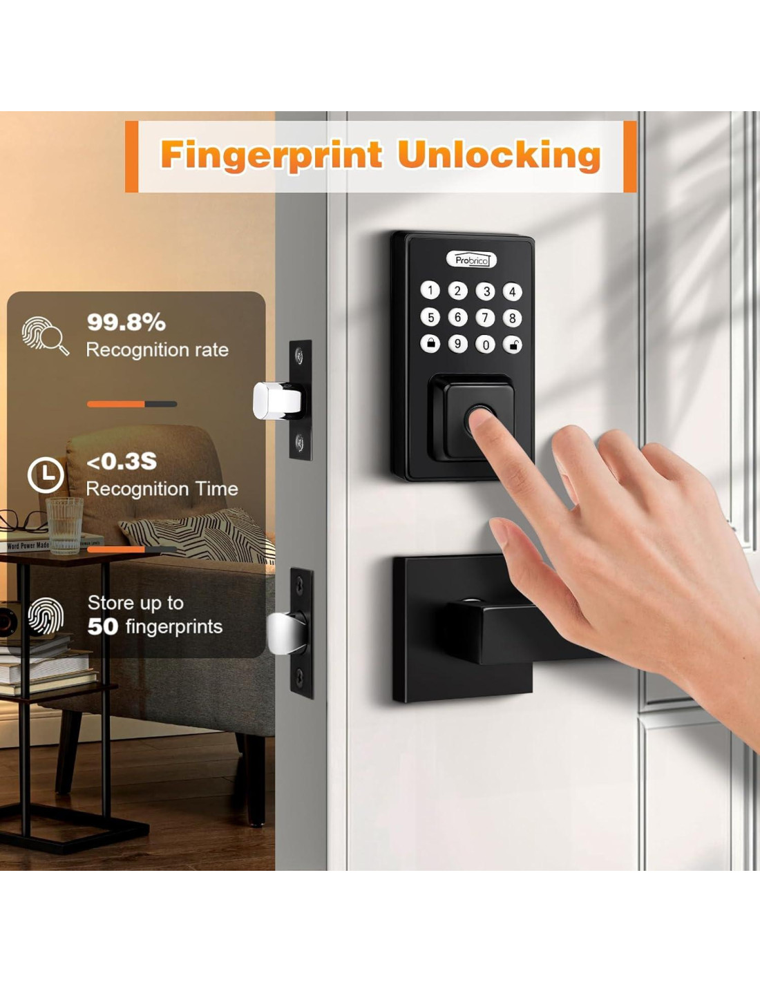 - [Desbloqueo por Huella Digital] utiliza tecnología biométrica, con una tasa de reconocimiento de hasta 99.8%, puede identificar con precisión su huella digital y desbloquear la puerta en solo 0.3s, acomoda de manera segura hasta 50 huellas digitales, asegurando un acceso sin problemas para múltiples individuos autorizados.