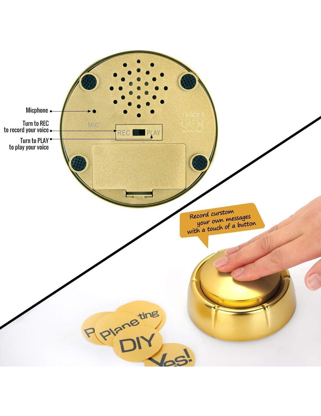 - Este botón hablante grabable se puede usar en juegos de fiesta.