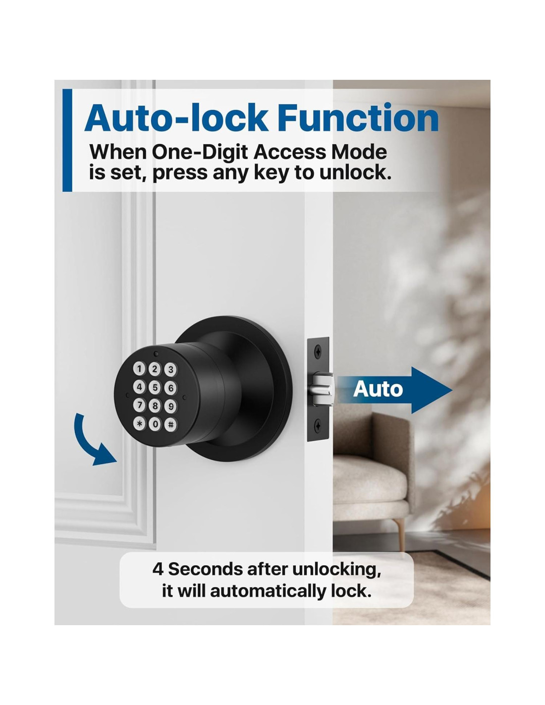 - Seguridad avanzada: Con función silenciosa, la perilla de puerta inteligente evita que otros escuchen sus códigos. La combinación de silencio y la contraseña de 15 dígitos aumenta la seguridad de la cerradura electrónica de puerta.