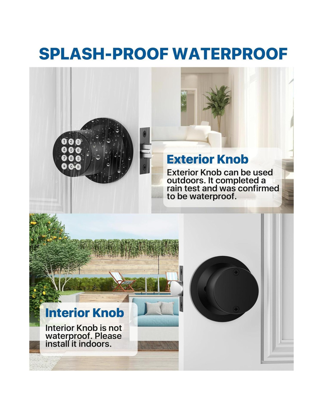 - Multifuncional: Se adapta a varias puertas como puerta de entrada, garaje, puerta trasera, dormitorio. Se recomienda instalar la perilla interior en interiores. Incluye una fuente de alimentación de emergencia para situaciones de agotamiento de baterías.