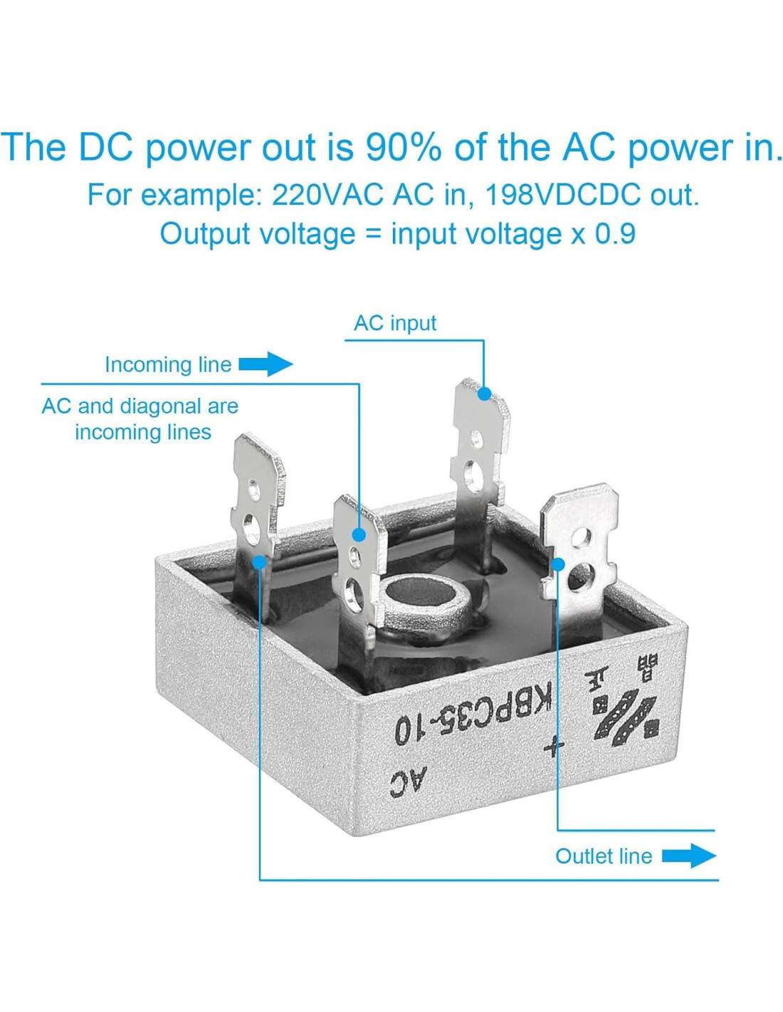 - Especificación: Tamaño: 29x29x22.5mm (1.16x1.16x0.9 pulgadas); Voltaje pico repetitivo inverso: 1000V; Corriente rectificada directa: 35A; Voltaje de aislamiento: 2500V; Corriente de carga resistiva: 15A; Lista de empaque: 2 Pcs Diodo Rectificador