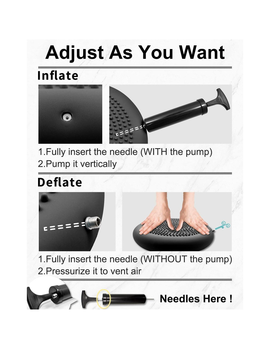 - [Ajusta Como Desees] - Infla o desinfla el cojín inestable Tumaz con una bomba de aire incluida en el paquete (dos agujas están colocadas cerca del mango de la bomba). Controla la presión del aire para adaptarla a tus necesidades para el entrenamiento, ejercicio de músculos centrales o entrenamiento de postura.