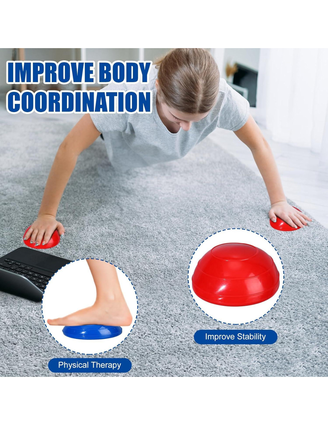 - Función útil: la media pelota de ejercicio puede mejorar la circulación y aumentar la coordinación, también mejorando tu agilidad, tiempo de reacción y resistencia, y puede aplicarse para ejercicio, masaje de pies y más