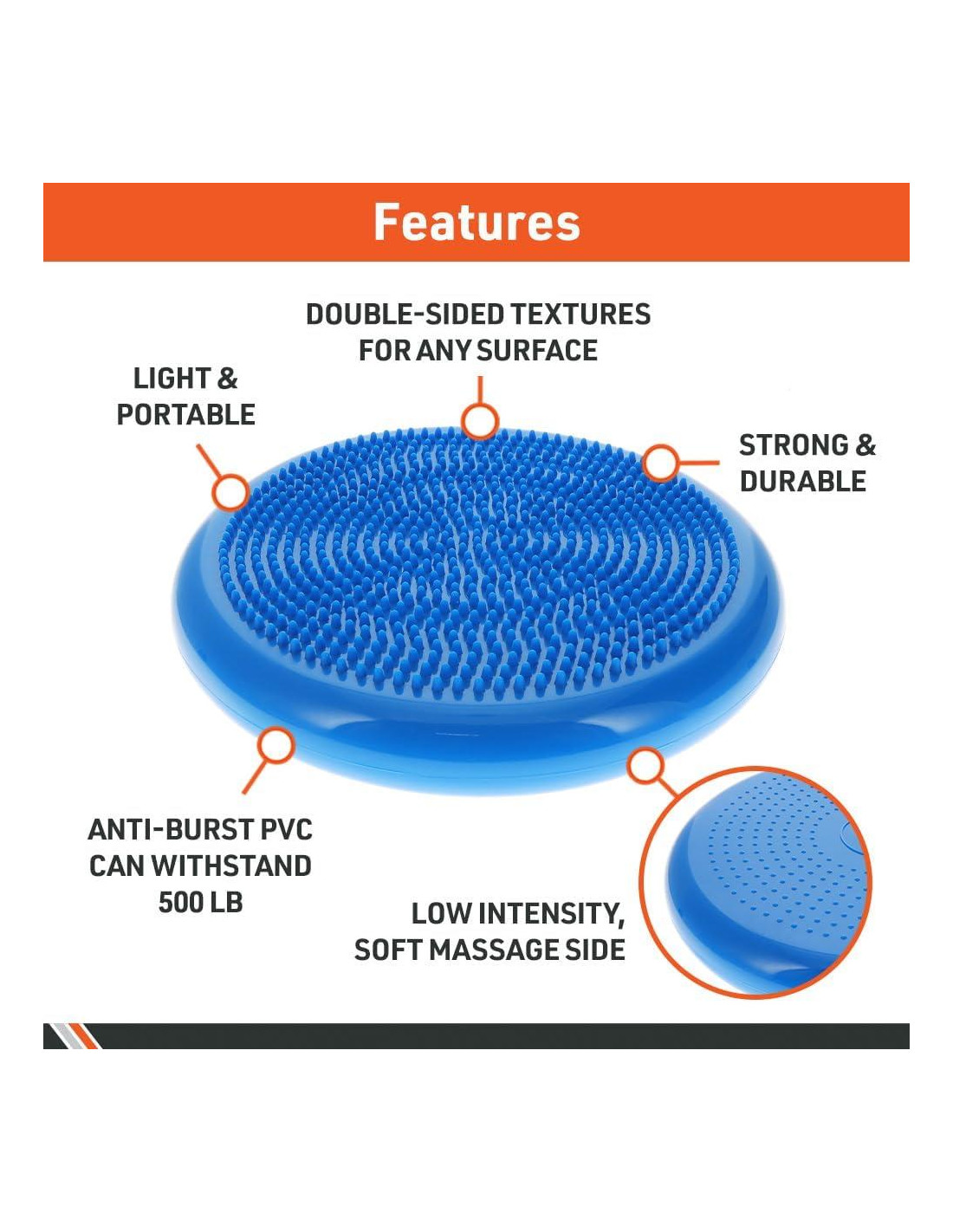 - Se puede usar como un cojín dinámico para activar los principales grupos musculares o como un disco de pie para entrenamiento de equilibrio y fortalecimiento de extremidades inferiores