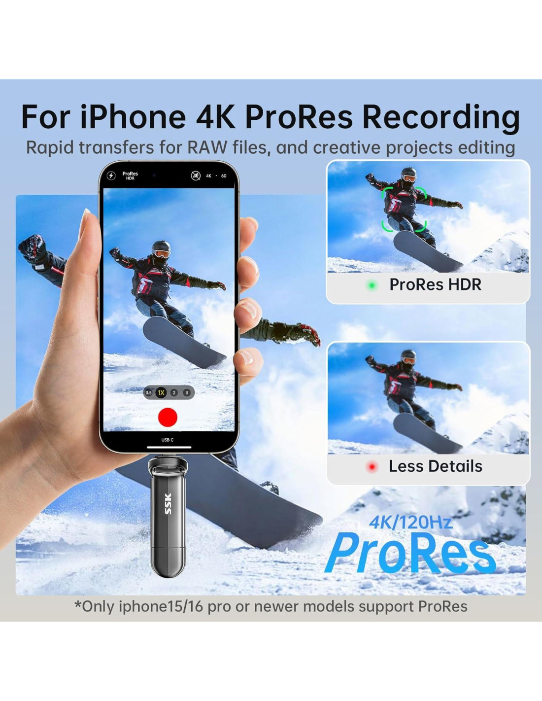 - Para iPhone 4K ProRes: Nuestro SSD portátil permite la captura de video 4K60Hz ProRes HDR para iPhone con velocidades constantes de 800+MB/s. SSD externo ideal para expandir la memoria en iPhone y otros dispositivos de bajo consumo, con un consumo máximo de energía de 3.6W.