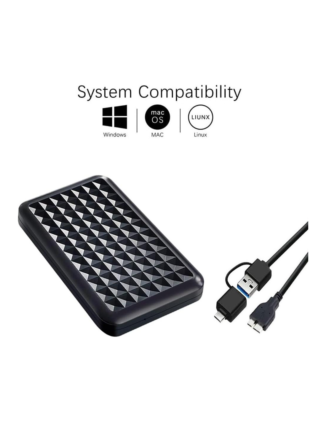 Capacidad: El tipo de sistema de archivos utilizado para el disco, la disposición de particiones y el tipo de sistema operativo podrían afectar la capacidad de almacenamiento real mostrada por su computadora. 1TB931GB Atención: 1. Los discos duros externos no pueden transferir datos entre diferentes marcas de dispositivos de juego o entre dispositivos de juego y equipos de oficina. 2. Necesita instalar este producto en su dispositivo de juego cuando use este HDD externo en su sistema de juego por primera vez. Por ejemplo, PS5 puede recibir el mensaje "El sistema de archivos de esta unidad USB no es compatible" al conectar un disco duro externo y puede mostrar una capacidad de almacenamiento incorrecta. Puede encontrar "Dispositivo de Almacenamiento USB" en la pantalla de "Configuraciones", seguir los pasos indicados por el sistema para instalar la unidad y formatearla, y estará lista para usar. Acerca de PS4, por favor encuentre "Dispositivo de Almacenamiento USB" en la interfaz de "Dispositivo" en "Configuraciones". Cuando desee usarlo en XBOX One, necesita reformatear la unidad al formato NTFS. Luego, simplemente siga los pasos indicados por la ventana emergente del sistema XBOX ONE para usarlo en el dispositivo. 3. Debido a las restricciones impuestas por los fabricantes de dispositivos de juego, diferentes sistemas necesitan diferentes formatos para usar. Puede consultar el Manual del Usuario para hacer coincidir su dispositivo de juego o sistema. Paquete Incluye: 1x Disco duro externo portátil 1 x Cable USB 2 en 1 1 x Manual del usuario
