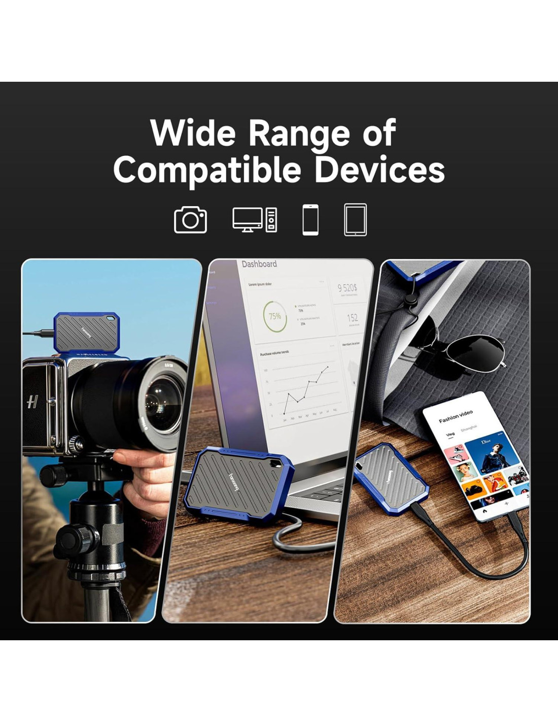 - Diseño Robusto y Compacto: el SSD Externo cuenta con un perfil delgado y de tamaño de bolsillo que combina durabilidad robusta con portabilidad ligera. El conveniente lazo de mosquetón te permite adjuntarlo a tu cinturón o mochila, haciéndolo perfecto para profesionales, jugadores, estudiantes, fotógrafos y creadores de contenido