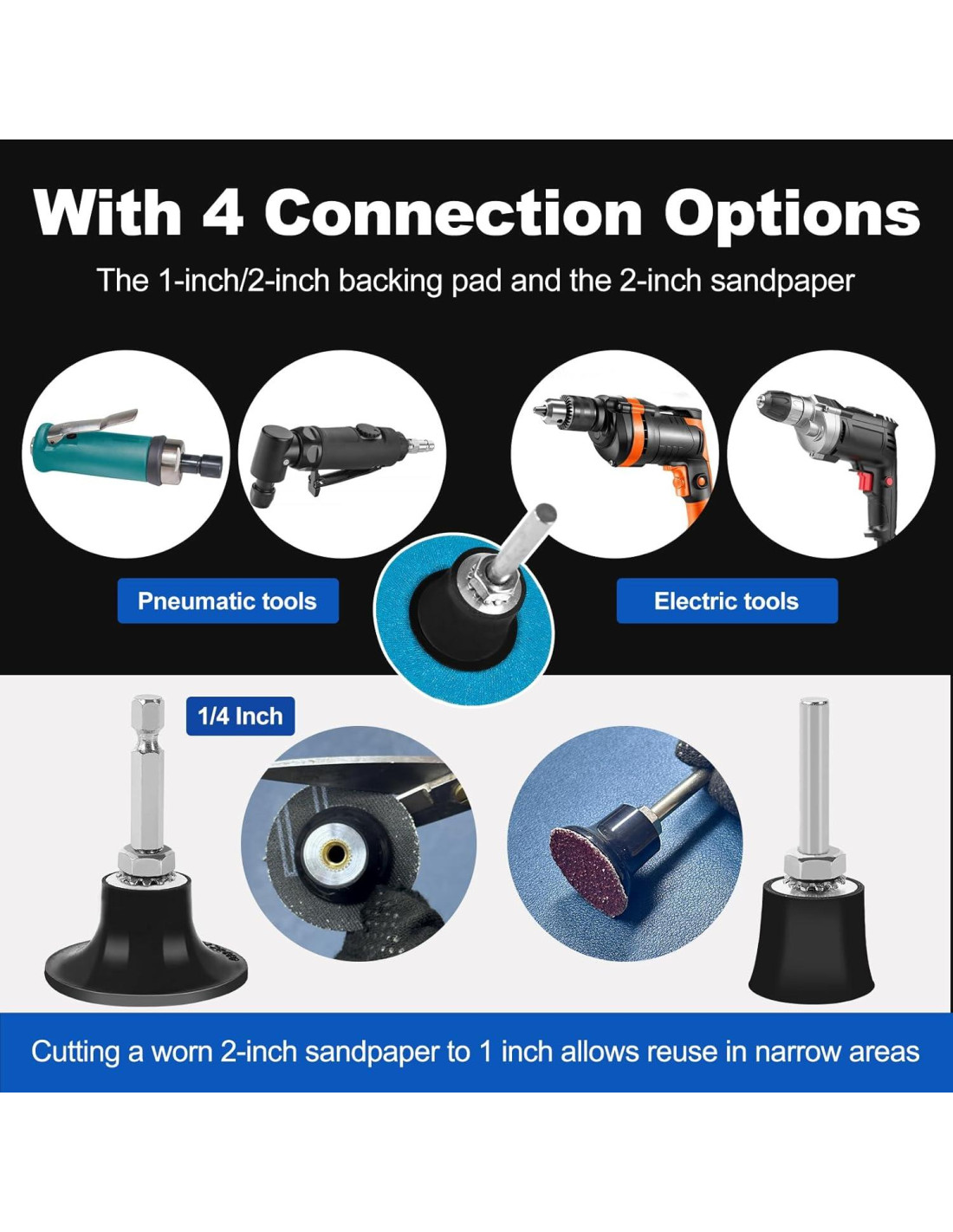 - Qué conexión se adapta a tu herramienta: Con puntas redondas y hexagonales de 1/4 de pulgada para herramientas de amoladora de aire M12 M18 y herramientas de lijado para taladro, con base de shank de roll lock de poliuretano flexible de 1 pulgada y 2 pulgadas, cumple con 4 formas de conexión. Cortar un disco de lijado de 2 pulgadas desgastado a 1 pulgada permite un uso continuo en áreas más estrechas, mejorando la flexibilidad.