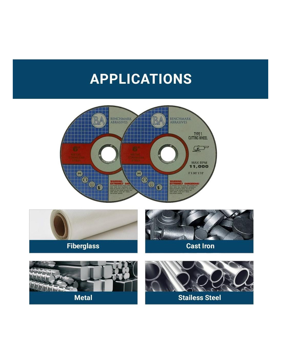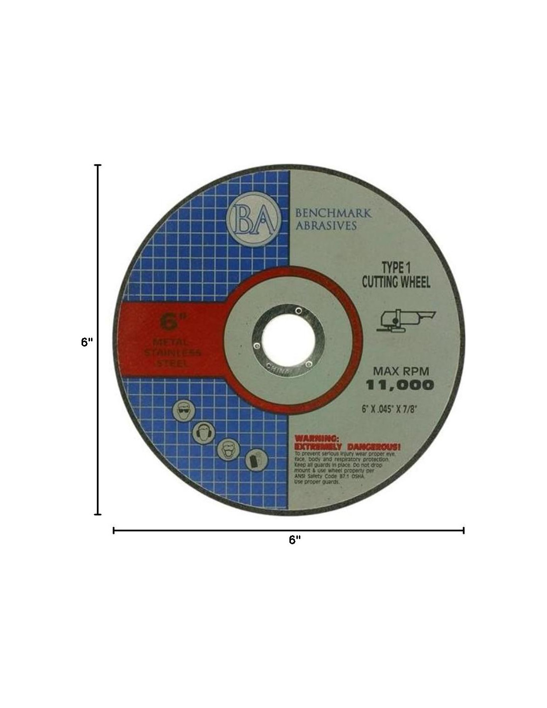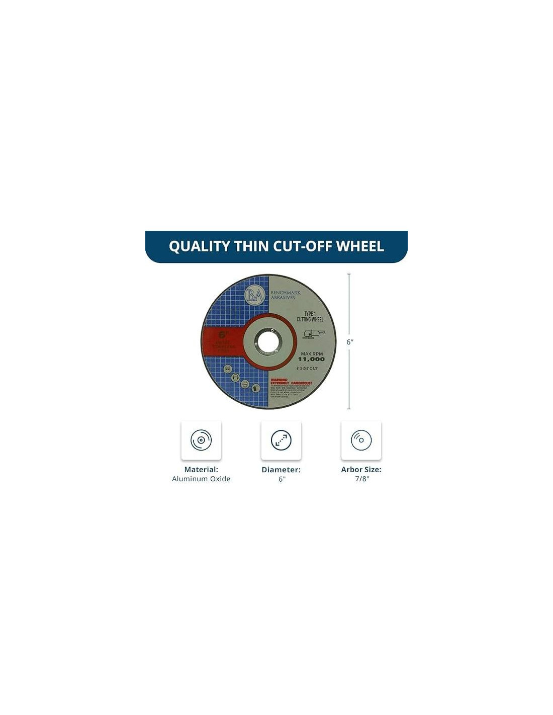 - RENDIMIENTO DE CORTE VERSÁTIL: Las ruedas de corte de 6 pulgadas de Benchmark Abrasives para metal con un arbor de 22.23 mm (7/8") son perfectas para cortar metal, acero, tuberías de metal, tubos, chapas planas, construcción naval, rieles y fabricación general de metal. Experimenta precisión en cada corte con nuestro disco de corte para amoladora angular diseñado por expertos. Usado por artesanos y entusiastas del bricolaje, estas ruedas de desbaste satisfacen todas tus necesidades con facilidad.