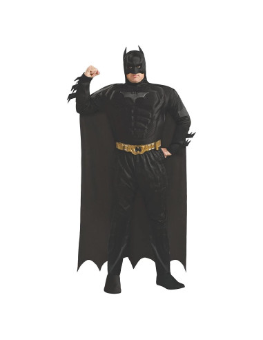 - Parte superior detallada de pecho musculoso de Batman con un abdomen marcado y músculos definidos para un aspecto heroico de DC Comics, combinada con pantalones que cuentan con botas adjuntas. Viene con una pieza para la cabeza con una capa adjunta y un cinturón moldeado para completar tu disfraz de Batman