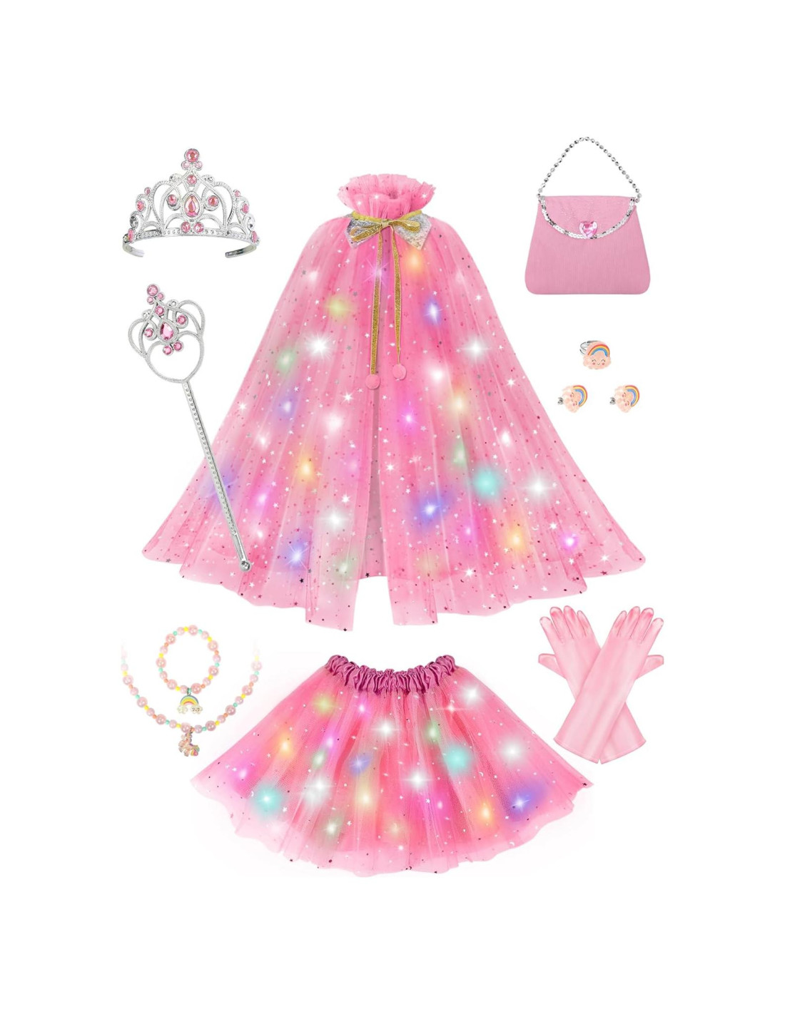 - Capa y Falda Mágicas Iluminadas: Tanto la capa de princesa como la falda pueden ensamblar tiras de luz coloridas con tres modos de brillo: brillo, destello rápido y destello lento. Estas luces deslumbrantes añaden un toque de magia, haciendo que tu pequeña princesa brille durante eventos especiales o en su tiempo de juego