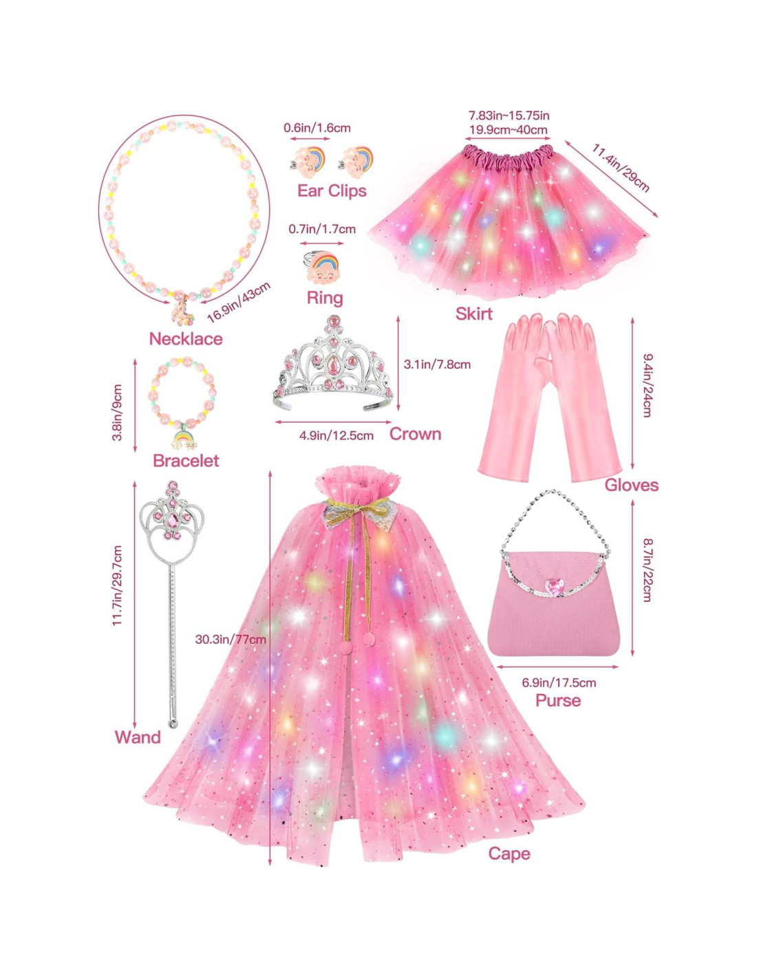 - Conjunto Completo de Disfraz de Princesa: Este adorable conjunto de ropa de disfraz para niñas de 3 4 5 6 incluye una capa y falda iluminadas, tiara brillante, varita, collar, pulsera, aretes, anillo, guantes elegantes y un lindo bolso. Es una maravillosa colección de juguetes de princesa para hacer realidad los sueños de princesa de tu hija
