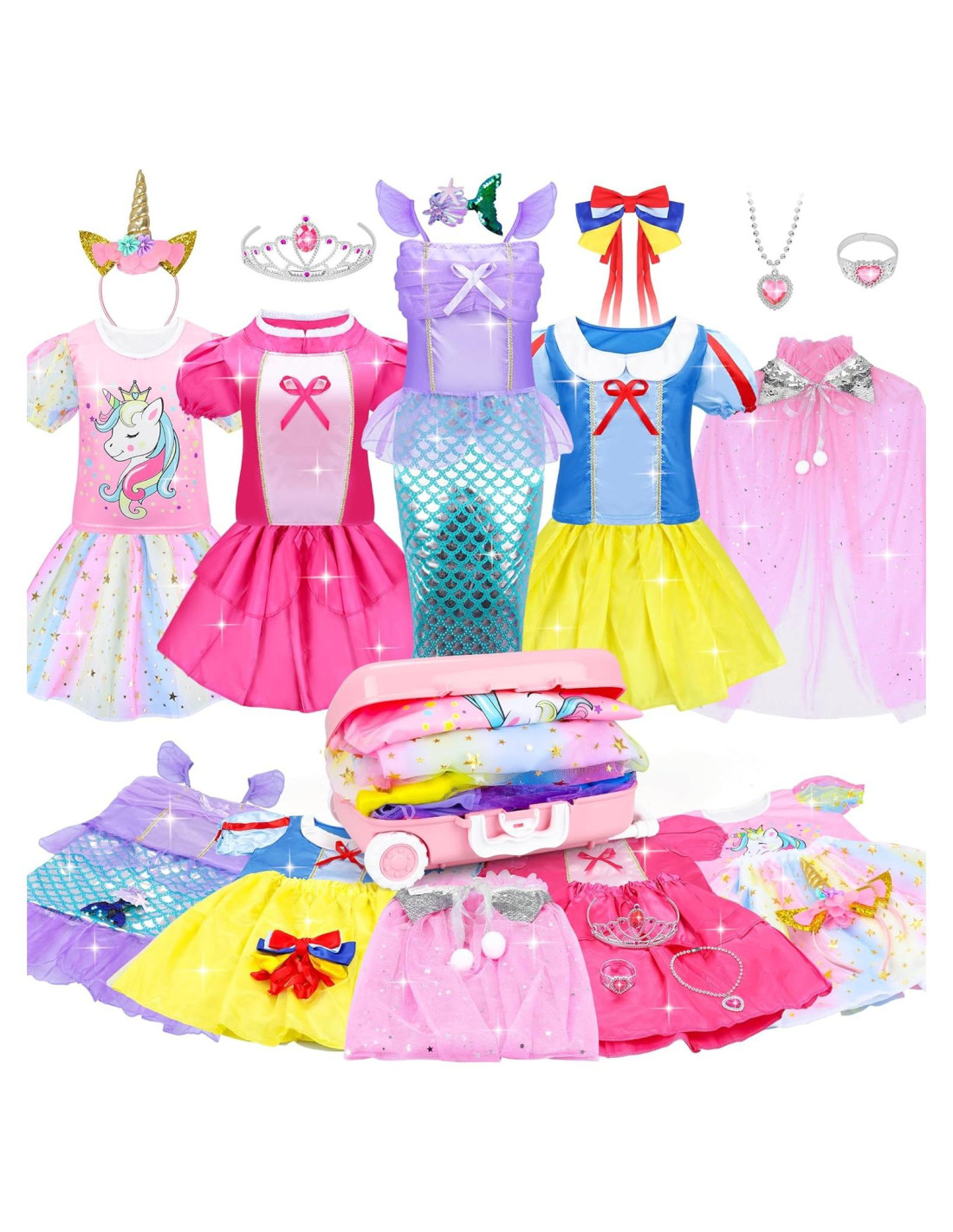 El traje de pequeña princesa de Rcovasc hace realidad el sueño de toda niña. ¡Póntelo y comienza un viaje de ensueño! Los detalles están hechos a la perfección y se utilizan materiales amigables con la piel para que cada pequeña princesa pueda disfrutarlo cómodamente y felizmente. ¡Empaca tus vestidos de princesa en tu maleta y lleva todos tus looks de princesa al baile, que será tu pasarela y toda la sala estará asombrada de ti! Cuatro vestidos de princesa y una capa, cada uno de los cuales está cuidadosamente diseñado por nosotros para hacer que tu niña sea la princesa más brillante. Grandes regalos de Navidad, Año Nuevo y cumpleaños para niñas de 3 4 5 6 7 8 + años, ¡apresúrate y regala este regalo único a tu bebé favorito!
