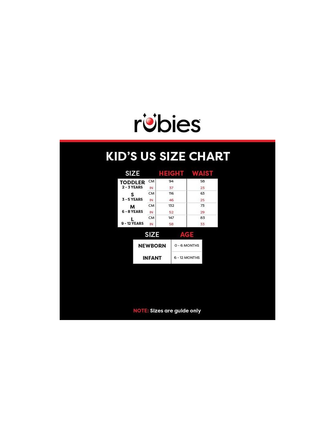 - Los disfraces tienen diferentes tallas en comparación con la ropa estándar y pueden variar entre marcas. Siempre consulta la tabla de tallas de Rubies para un ajuste preciso. Evita elegir basándote en la edad o tamaño de ropa de tu hijo para asegurar el mejor ajuste
