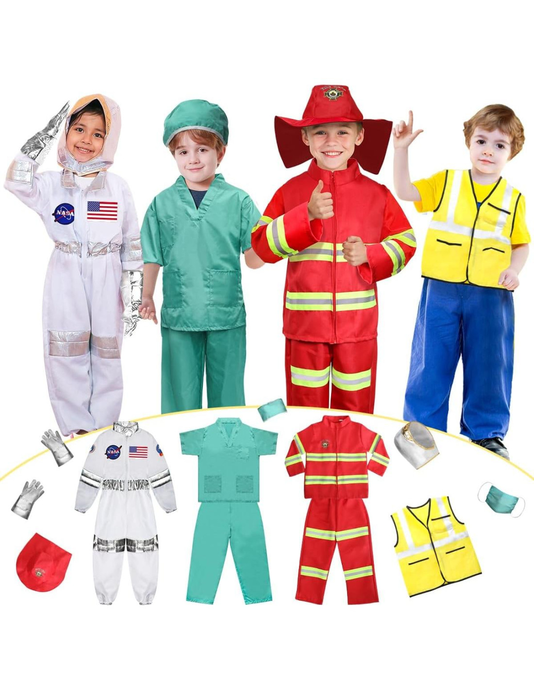 - Tu pequeño ya no necesita dudar sobre su carrera soñada, ahora puede realizar todos sus sueños con esta Ropa de Carrera para Niños de LOYO. 12 piezas de Disfraces de Carrera de LOYO para Niños contienen 4 roles de bombero / astronauta / doctor / chaleco de trabajador, es un disfraz perfecto para niños para Halloween, fiestas de disfraces o simplemente tiempo de juego de simulación para niños en edad preescolar de 3 a 8 años.