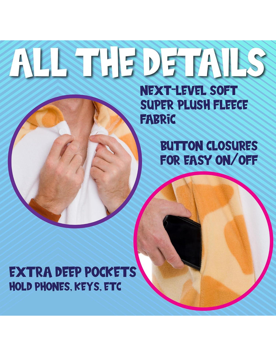 - CÓMODO - Una mezcla especial de comodidad y diversión, estos materiales de peluche son suaves al tacto y te mantendrán abrigado durante esos fríos meses de invierno. El cierre de botón del traje permite que te vistas rápidamente mientras que el corte holgado te da la flexibilidad de usarlo fácilmente sobre tu ropa o chaqueta existente.