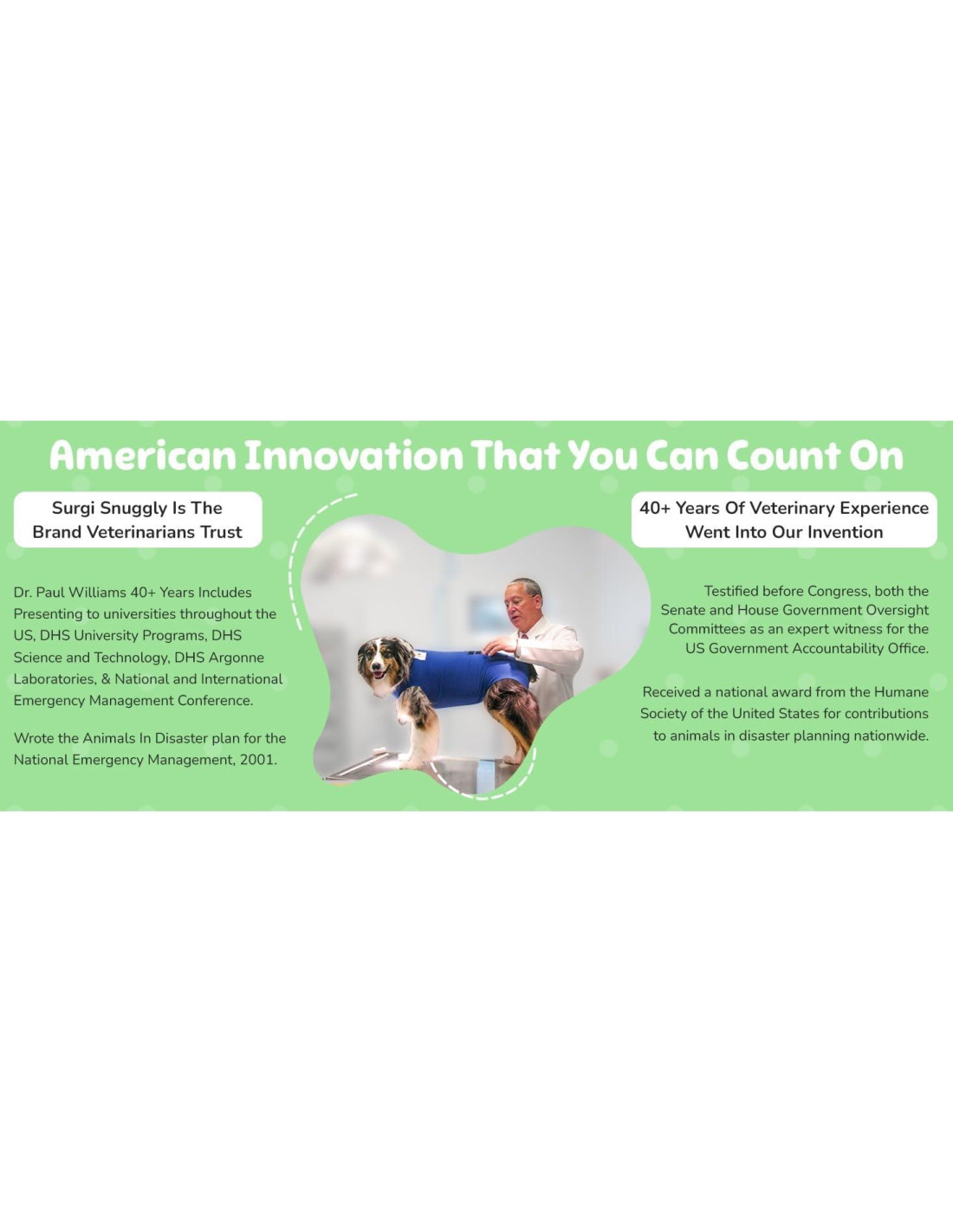 - Inventado por el Dr. Paul Williams, un Veterinario, el Traje de Recuperación Surgi Snuggly se ha convertido en la elección entre veterinarios y dueños de mascotas porque proporciona una solución práctica, segura, consistente y efectiva para la recuperación postquirúrgica en mascotas.
