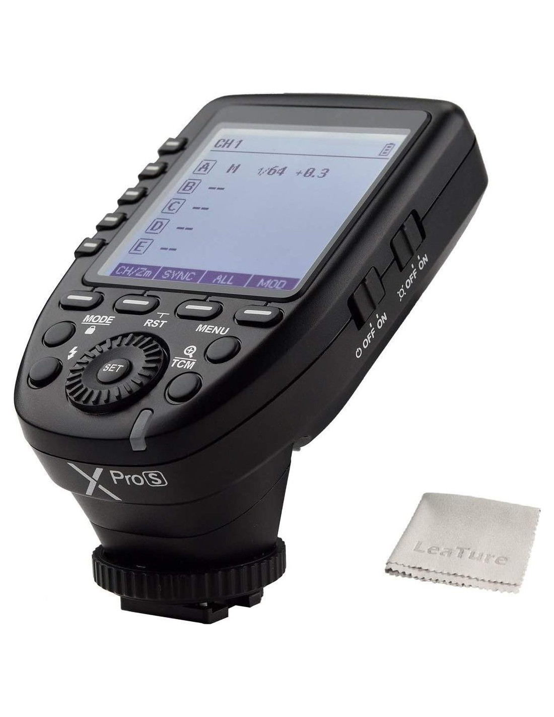 - BOTÓN TCM INTELIGENTE: Mantener presionado el botón TCM puede transformar el valor de flash en modo TTL en el valor de salida de potencia en modo M; Presionar brevemente el botón TCM permite cambiar entre el modo de un grupo y el modo de múltiples grupos.