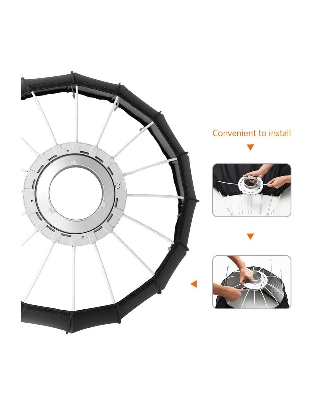 - P90L 16 montura de ranura de metal y 16 varillas de alta resistencia y gran dureza hacen que el softbox sea robusto y amplían la guía de enfoque de luz. Fácil de instalar y quitar con el sello de cierre mágico. Abre el softbox en el suelo plano y, simétricamente, inserta las 16 varillas en el anillo adaptador.