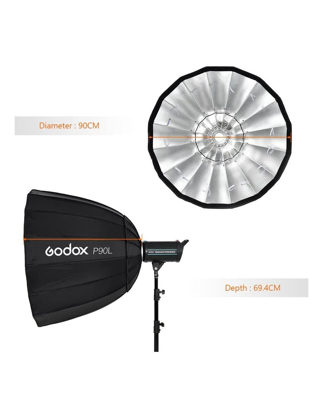 - [P90L Parámetros básicos] Diámetro: 90cm, Profundidad: 69.4cm, Peso: 1200g. Compatible con la mayoría de las luces de estudio, flash estroboscópico, etc. Totalmente compatible con productos Godox. Diseño hexadecagonal hace que la luz sea más uniforme que el octagonal.