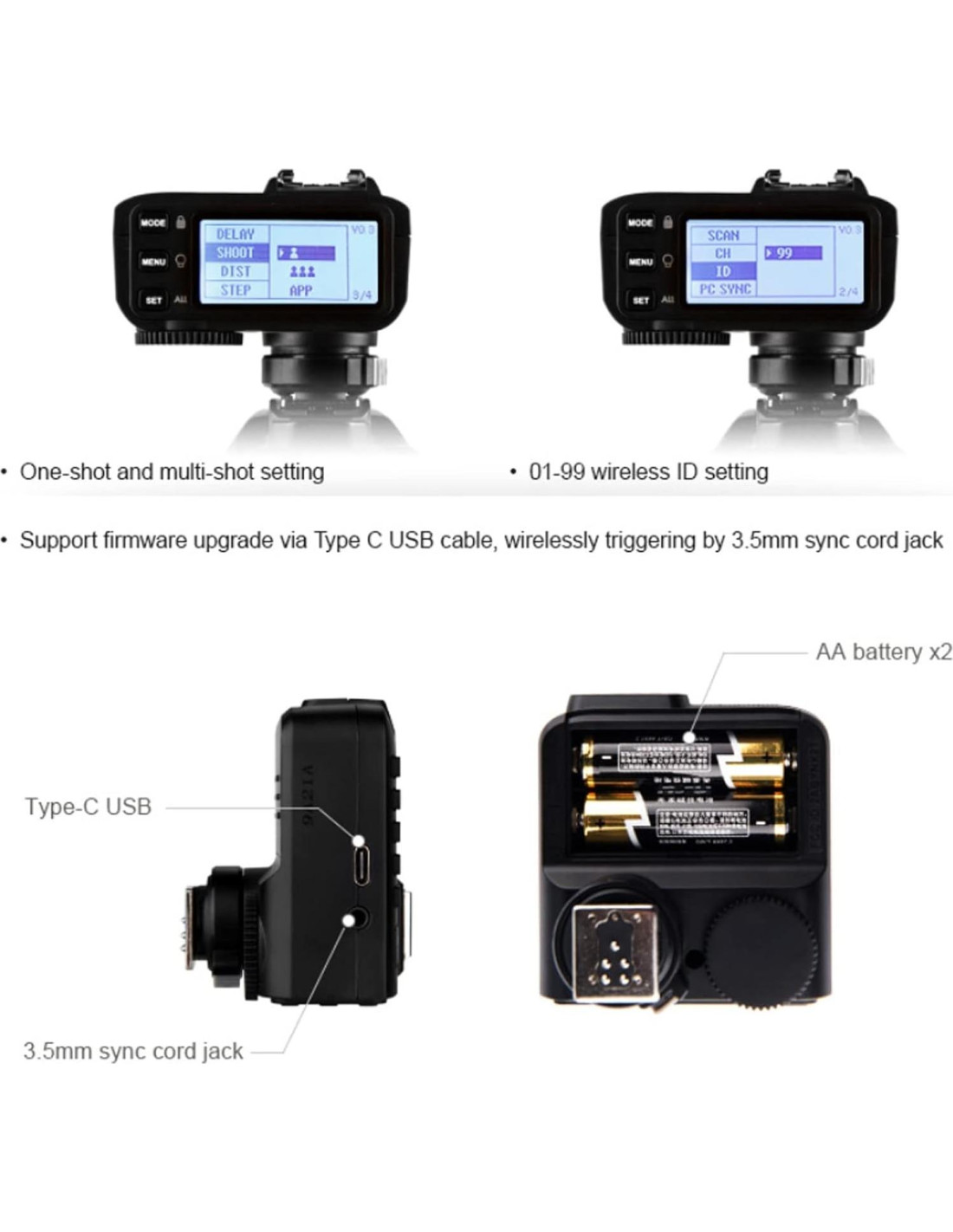 - [Puerto de sincronización de 3.5mm y USB Tipo-C] Puede funcionar como un disparador de flash Godox inalámbrico/disparador de liberación de obturador inalámbrico/disparador de speedlights Canon inalámbrico/disparador de flash con conector de cable de sincronización de 3.5mm.