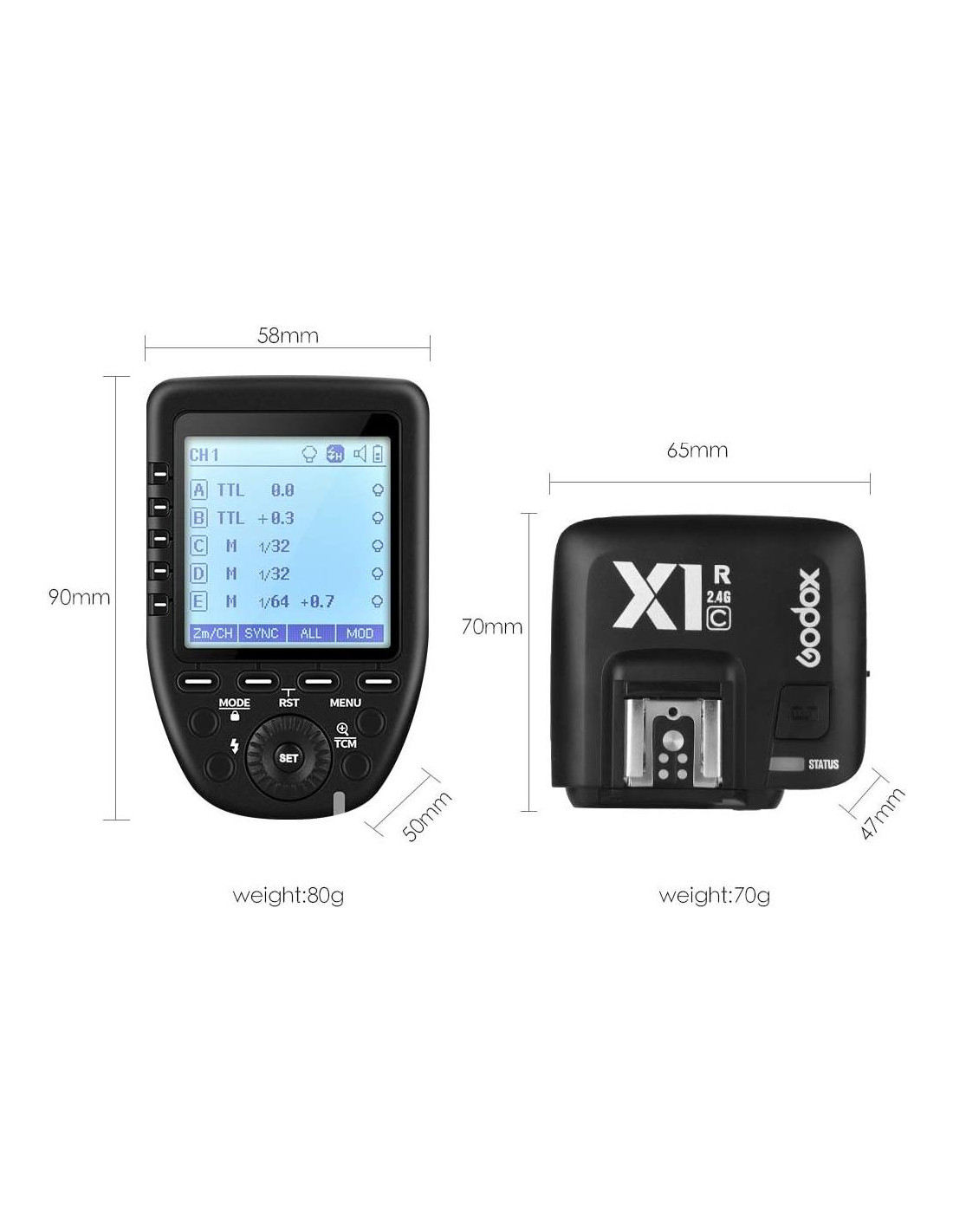 - Combinación Perfecta - Godox Xpro-C TTL Disparador Inalámbrico con sistema inalámbrico Godox X incorporado que puede controlar el flash de la cámara, flash exterior así como flash de estudio, cuando se combina con el receptor Godox X1R-C, también puede controlar los flashes originales compatibles con Canon. Presenta activación por múltiples canales y transmisión de señal estable, combinación perfecta para solución de flash de estudio.