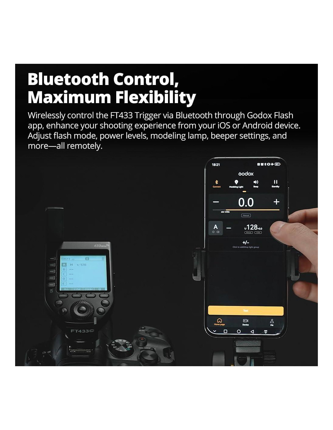 - Control Bluetooth Máxima Flexibilidad: Controle el Disparador FT433 de forma inalámbrica a través de Bluetooth mediante la aplicación Godox Flash, mejorando su experiencia de disparo desde su dispositivo iOS o Android. Ajuste el modo de flash, niveles de potencia, lámpara de modelado, configuraciones de timbre y más, todo de forma remota.