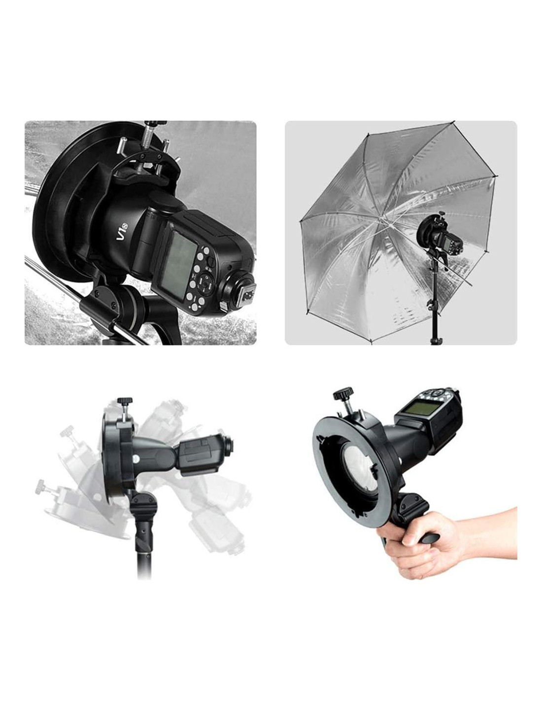 - [Soporte Godox S2 para Speedlite] El soporte de flash Godox S2 es una versión actualizada del soporte de tipo S. Es adecuado para más flashes y estroboscópicos, como Godox AD200Pro, AD200 Pro II, AD400Pro, AD300 Pro, para V1/V1 Pro Speedlite de Cabeza Redonda, V860III/V860II/TT685/TT350 Series, Soporte de Tipo S Versión Actualizada Soporte de Flash de Montura Bowens, Control de Inclinación Preciso, Montura de Paraguas Integrada.