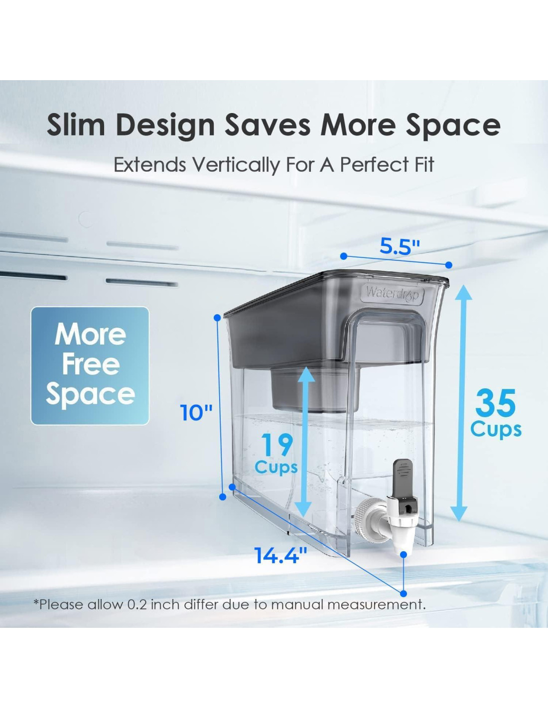 - [Apariencia elegante y delgada]: Este dispensador de filtro de agua elegante y delgado está diseñado con dimensiones que ahorran espacio de 14.37*5.55*9.95 pulgadas (36,4*14,1*25,3 cm). La capacidad de 35 tazas (19 tazas en el cuerpo) de este dispensador de filtro de agua puede satisfacer las necesidades de agua de toda la familia. Por favor, verifica el tamaño de tu refrigerador antes de comprar para asegurarte de que el dispensador encaje perfectamente.