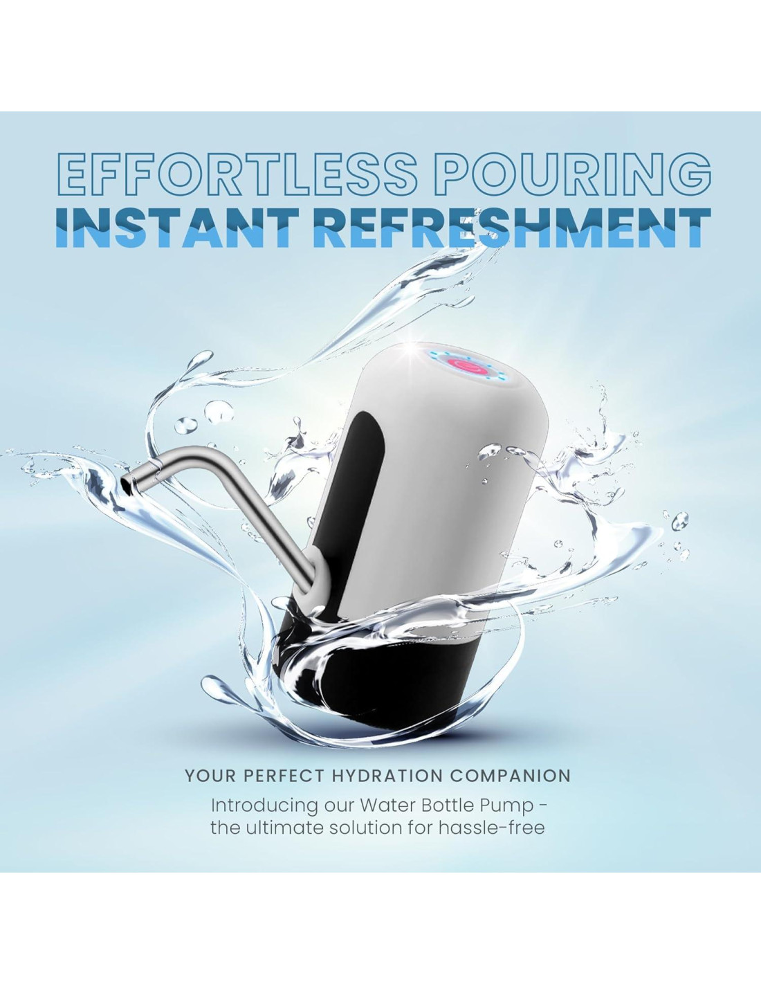 - Simplemente fije la bomba de agua en la boca de la botella. Operación con un solo interruptor, totalmente libre de complicaciones incluso para niños y ancianos.
