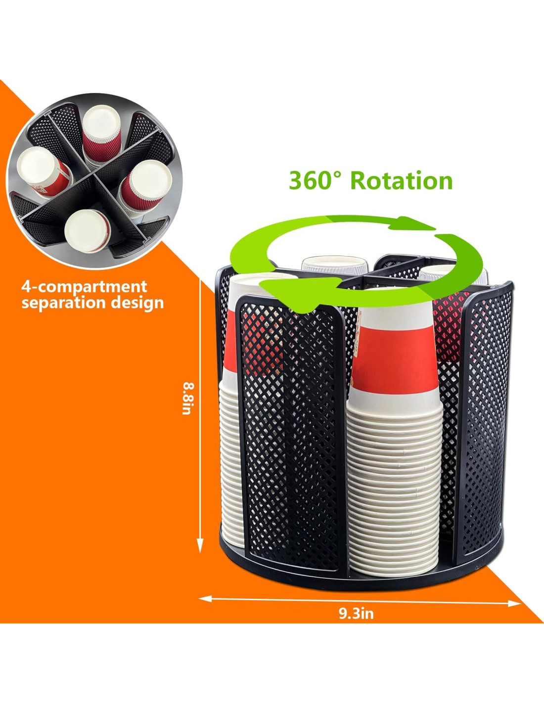 - [Organizador de Tazas y Tapas Rotativo de 360] El organizador de tazas de café cuenta con un diseño rotativo de 360 que gira suavemente para mantener a tus hijos, personal y clientes al alcance de las tazas de papel desechables, tazas de bebida y tapas. El calibre ensanchado facilita tomar y colocar las tazas, ¡y despídete de la molestia de volcar las tazas de papel!