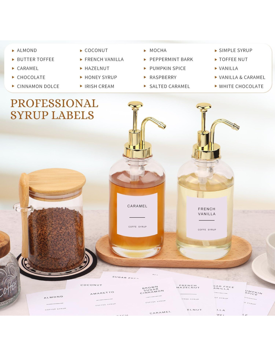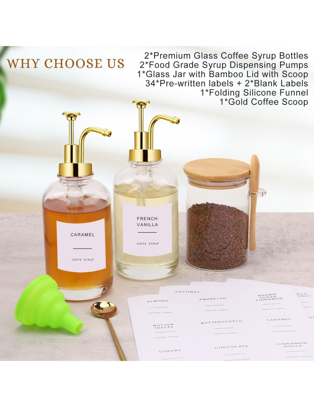 - Accesorios Completos: La cuchara de mango largo es perfecta para revolver café, mezclar té helado y más; un embudo de silicona para dispensar líquidos con precisión en el dispensador y mantener el bar de café limpio y ordenado; y etiquetas preimpresas para mantener el bar organizado y funcionando de manera eficiente