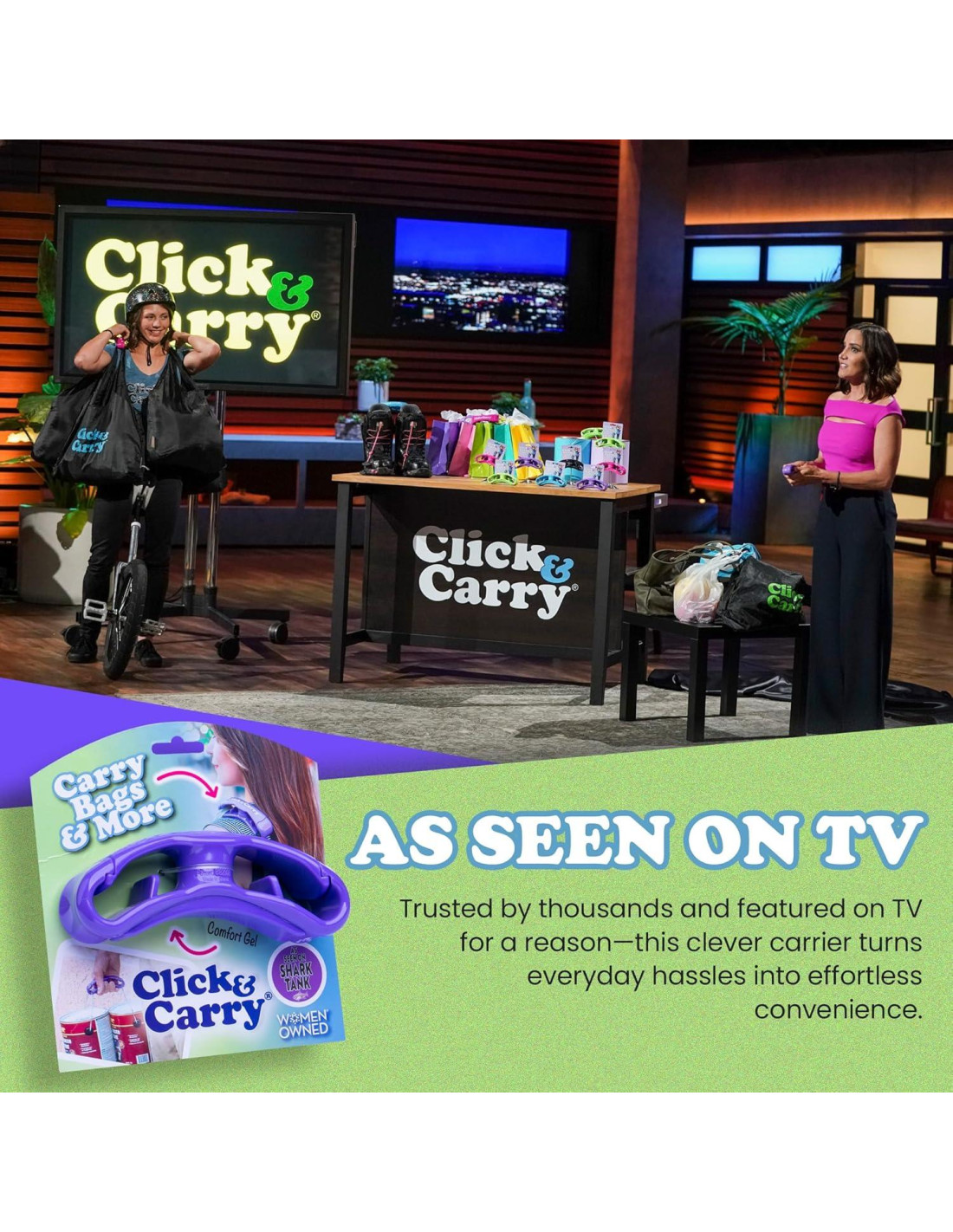 Click & Carry es un dispositivo de transporte simple que permite a los compradores gestionar y llevar múltiples bolsas a la vez - ya sea en las manos o sobre el hombro para un transporte "manos libres". Click & Carry es un salvador para los ancianos que enfrentan desafíos de destreza, útil para entusiastas de la construcción y bricolaje que llevan latas de pintura y cubos de construcción, y también es ideal para los aficionados a los deportes que transportan su equipo. ¡Los usos de Click & Carry son prácticamente ilimitados! Click & Carry "mágicamente" se sienta sobre el hombro distribuyendo el peso de manera uniforme a cada lado del C&C. Click & Carry - ¡Cárgalo todo! Lleva múltiples bolsas. Para su conveniencia, ofrecemos Click & Carry en paquetes individuales y dobles. No solo se vio Click & Carry en Shark Tank, Kim pudo hacer un trato con los Sharks (Mark y Barbara) y Click & Carry ahora es un gran éxito. Nuestro diseño patentado permite una distribución de peso igual de bolsas y otros objetos pesados para ser transportados cómodamente con acolchado de gel. Con un peso de solo 3.2 onzas (0.09 kg), Click & Carry es ligero, pequeño y se puede guardar fácilmente en su bolso, mochila o en el maletero de su auto. Simplemente pase el mouse sobre cualquier número para más información. ¿Para quién está diseñado Click & Carry? Los padres pueden manejar las compras mientras equilibran a los niños y las llaves | Los habitantes de apartamentos ahorran múltiples viajes llevando las compras en un solo viaje | Los ancianos limitan la dificultad y el dolor artrítico al llevar cargas pesadas | Los aficionados al bricolaje pueden transportar fácilmente cubos y latas de pintura. ¿Cómo uso Click & Carry? GIRE la parte superior para abrir | CARGUE las bolsas con mango a cada lado, distribuyendo el peso de manera uniforme | HAGA CLIC en la parte superior de nuevo en su lugar para asegurar las bolsas | LLEVE el dispositivo en la mano, acolchado por el cómodo agarre de gel, o USE Click & Carry sobre su hombro y vaya MANOS LIBRES. ¿Cuánto peso soporta Click & Carry? Click & Carry puede soportar aproximadamente 100 lb (45.4 kg) en total, lo que equivale a hasta 50 lb (22.7 kg) a cada lado de Click & Carry. ¿Cuáles son algunos usos adicionales para Click & Carry? Llevar limpieza en seco | Transportar botas de esquí | Transportar latas de pintura o cubos de construcción | Llevar equipos deportivos difíciles como bates de béisbol y pelotas de fútbol | Puede usarse como soporte para iPad e iPhone | Para pasear múltiples perros a la vez. ¿Cuántas unidades de Click & Carry vienen en un paquete? Una unidad individual de Click & Carry | Un paquete de 2 unidades de 2 Click & Carries (2 unidades en total) | Un conjunto agrupado de 1 unidad de Click & Carry + 2 bolsas reutilizables.