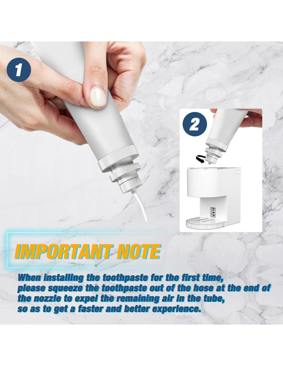 Nota: Al instalar la pasta de dientes por primera vez, por favor exprime la pasta de dientes fuera de la manguera en la parte inferior de la boquilla antes de usar - para expulsar el aire del tubo.