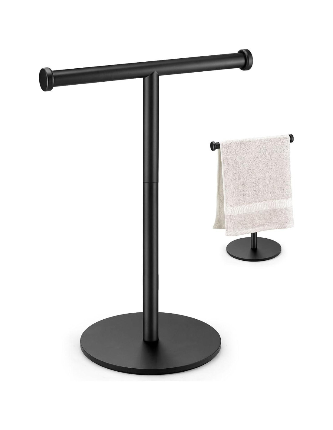 - 3. Base Estable: El Soporte para Toallas de Mano de Pie tiene una base pesada para una estabilidad super. También te encantará el cojín antideslizante negro en la parte inferior, para que no raye tu encimera