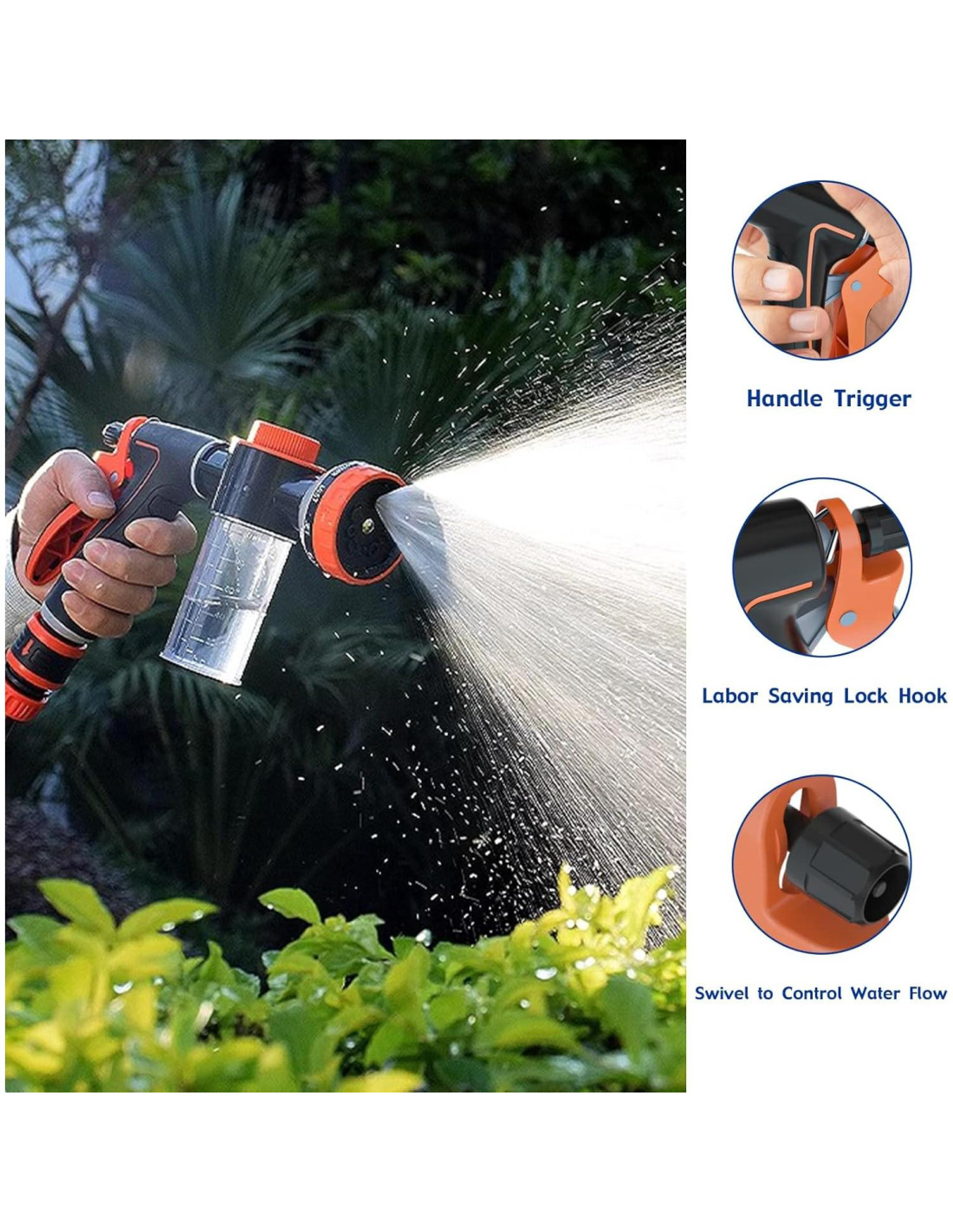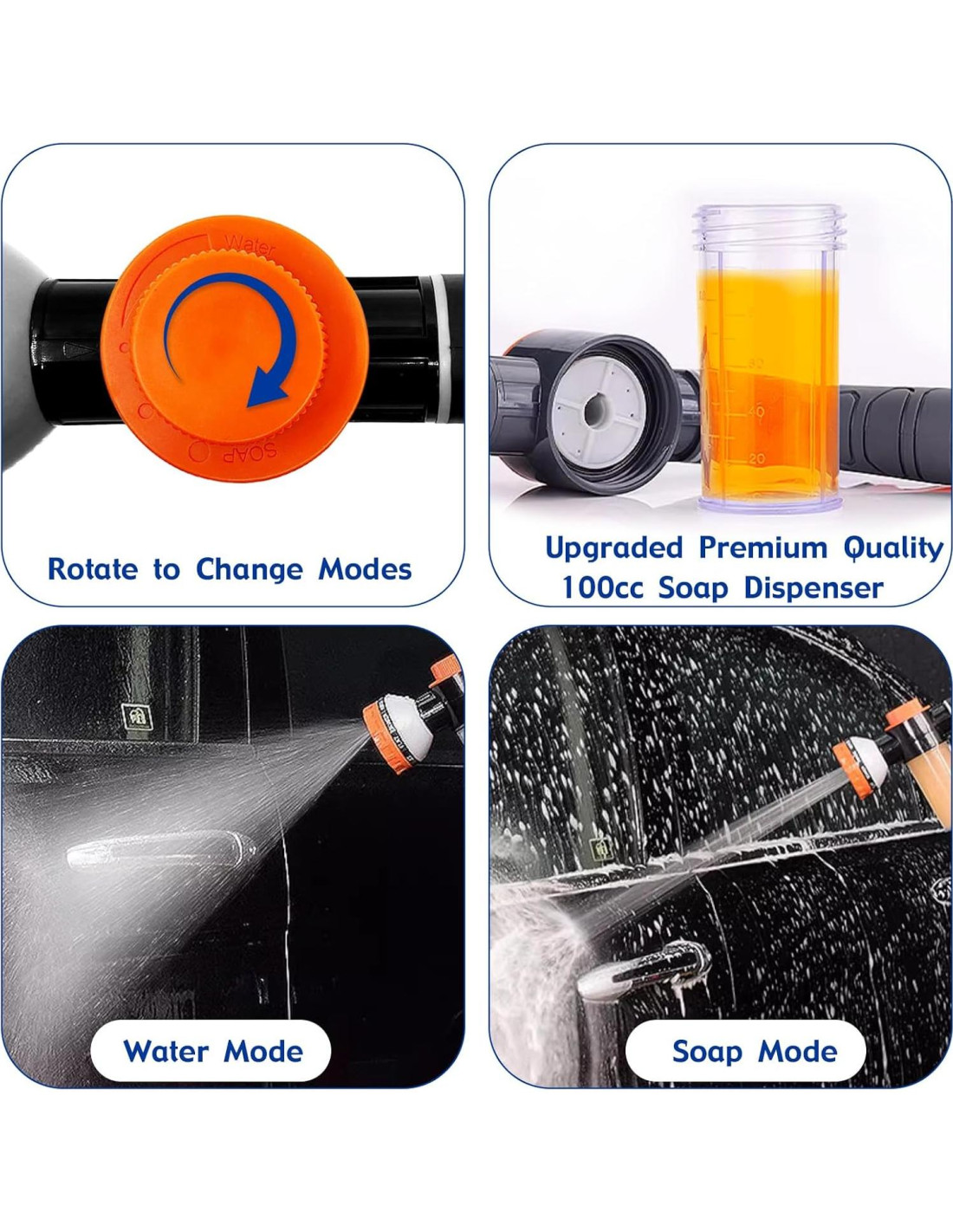 - 10 patrones de rociado para todas tus necesidades de lavado-- La pistola de espuma tiene 10 tipos de boquillas, selector de rociado giratorio con diferentes configuraciones (enjuagar, vertical, plano, centro, ángulo, chorro, ducha, niebla, empapador y cono) que pueden rociar agua en 10 patrones para diferentes usos. El lavador a chorro es perfecto para tu mascota, caballos, regar plantas y flores, lavar coches y perros.