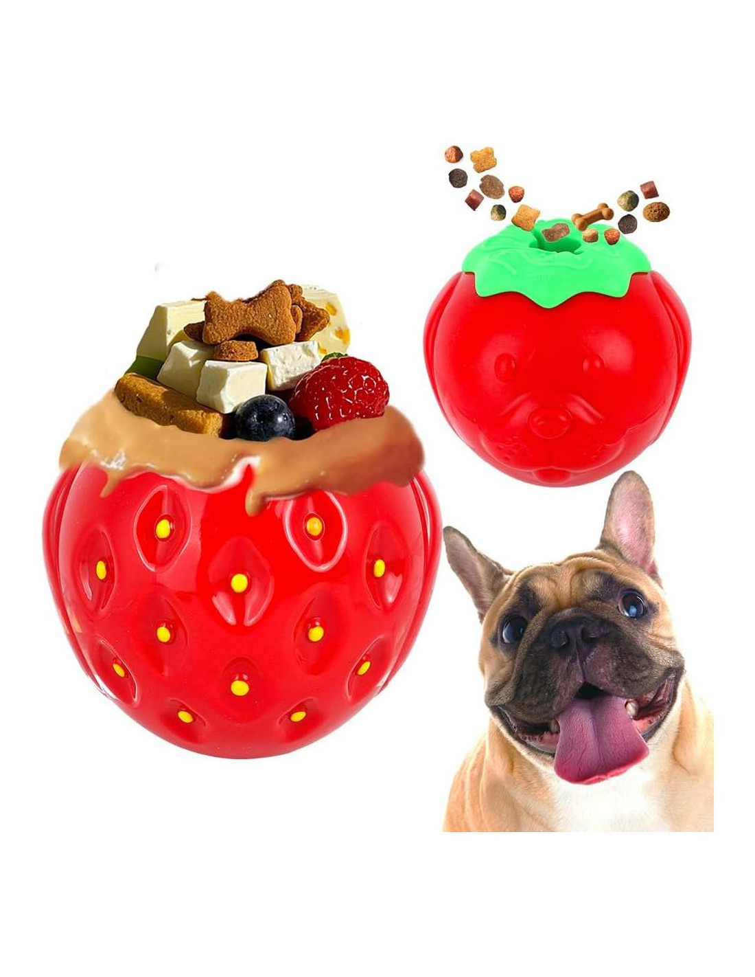 - Juguete Masticable de Fresa para Perros: Este juguete innovador combina la dispensación de comida seca, dispensación de golosinas, taza de alimentación lenta para comida húmeda y otras características. Sirve como un juguete masticable, juguete interactivo para interiores y juguete de entrenamiento en jaula, ofreciendo diversas experiencias y diversión
