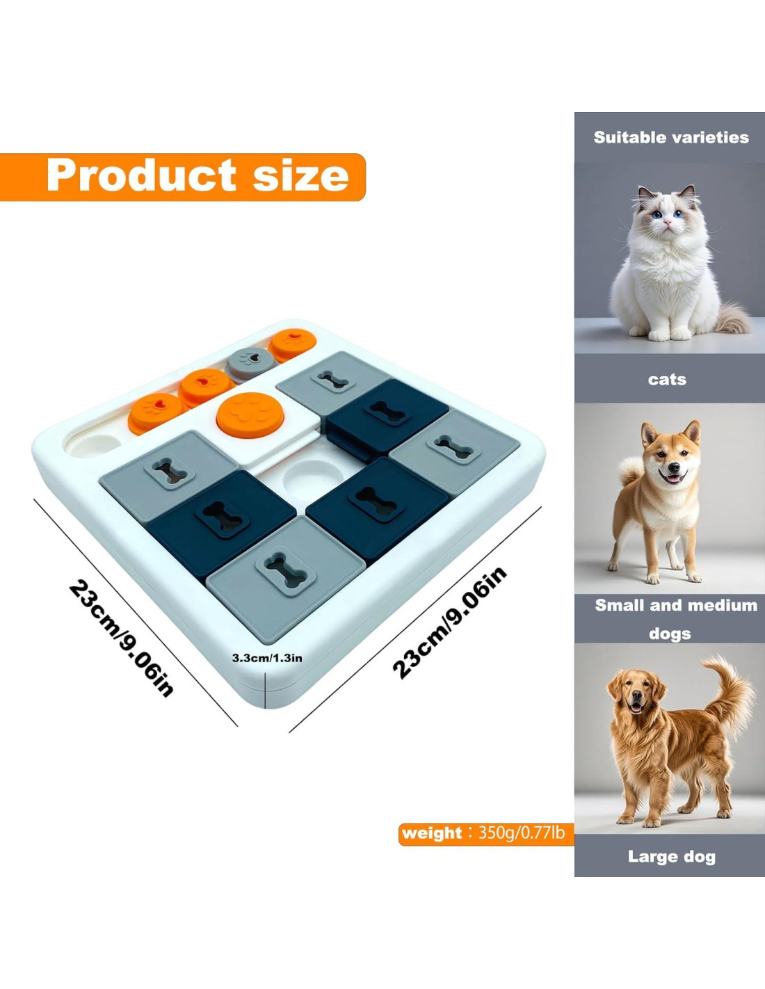 - Desafío de múltiples niveles - Este juguete de rompecabezas para perros tiene tres modos de juego: un botón de sonido circular en el medio, un modo simple a la izquierda y un desbloqueo deslizante de 5 rejillas. El nivel de dificultad de la 8 rejilla a la derecha ha sido mejorado, y necesita ser desbloqueado deslizándose hacia adelante y hacia atrás