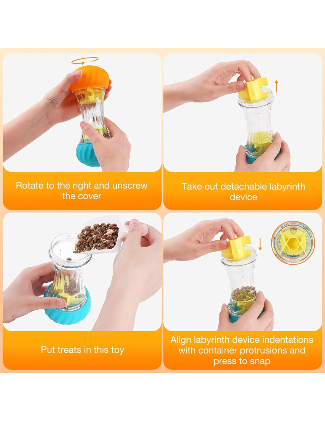 - Materiales amigables para perros: Los juguetes dispensadores de golosinas para perros están hechos de ABS y silicona suave. Para hacer que los rompecabezas para perros inteligentes sean más silenciosos al rodar, el material de los juguetes de enriquecimiento para perros está hecho de goma, menos ruido. No apto para masticadores agresivos.